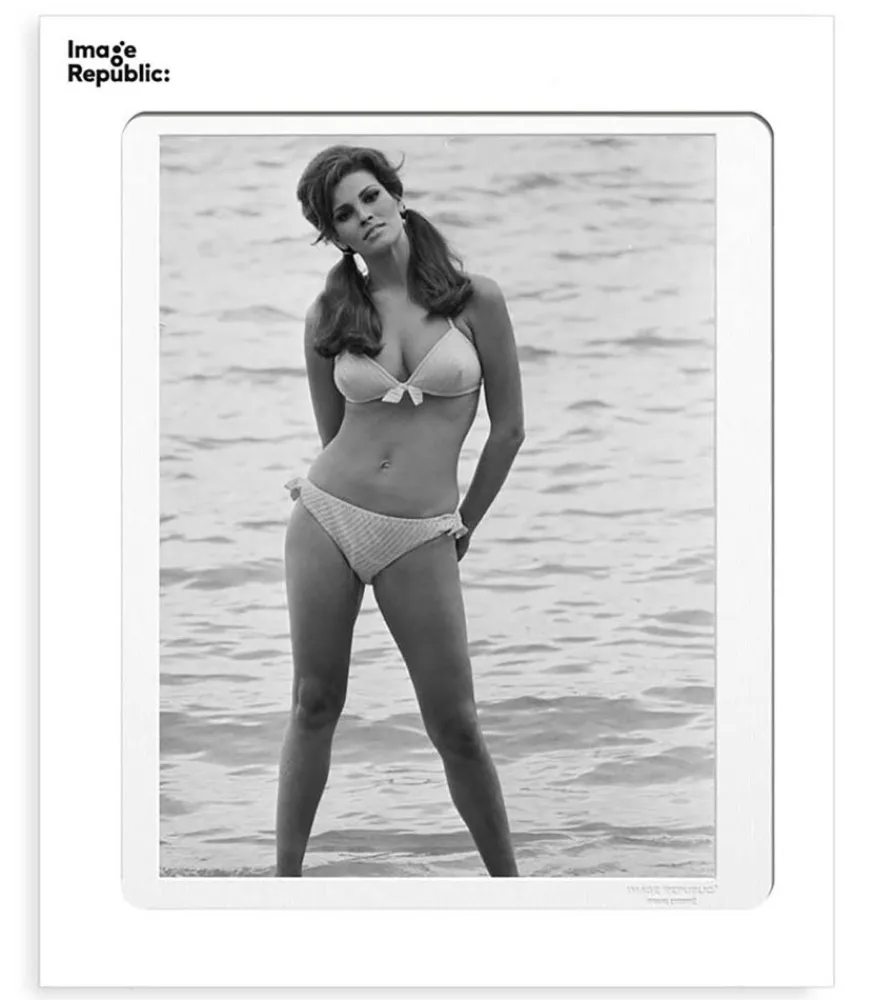 Affiche La Galerie Par Image Republic Reprenant Un Cliché En Noir Et Blanc De L’Actrice Américaine Raquel Welch Prenant La Pose En Bikini Au Bord D’Une Plage. Accrochée Sur Le Mur D’Un Salon Ou D’Un Bureau, Cette Affiche Apporte À La Pièce Une Touche Rétro Et Élégante. Format 38 X 56 Cm.