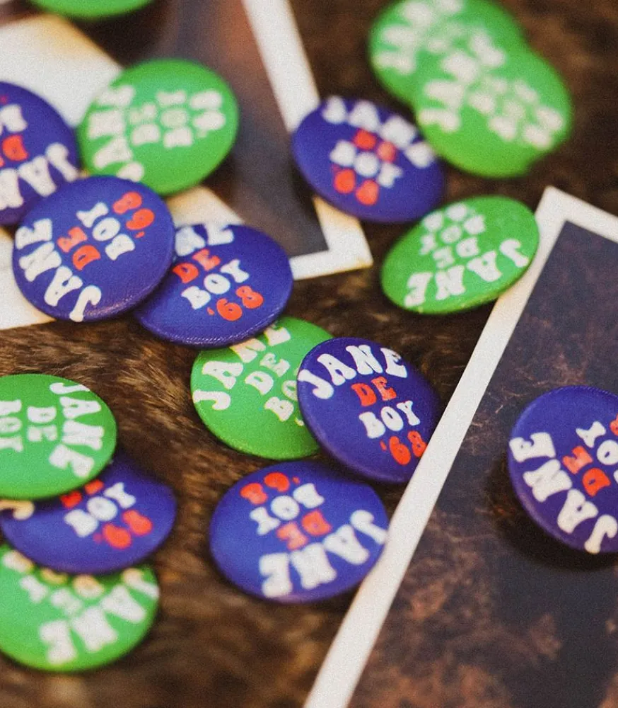 Badge En Tissu Jane De Boy’ 68 Navy, Idéal Pour Personnaliser Toutes Les Pièces De Votre Dressing. Conçu Par Newtone En Collaboration Avec Jane De Boy, Ce Modèle Arbore L’Iconique Inscription « Jane De Boy’ 68 » En Blanc Et Rouge Sur Fond Bleu Navy.