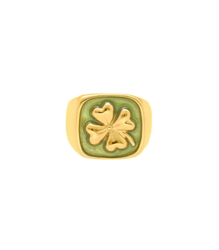 Bague Talisman Trèfle De La Maison Goossens, Créée En Métal Doré Trempé Dans Un Bain D’Or 24 Carats Orné D’Émail Coloré Et D’Un Trèfle Doré Au Centre. Le Trèfle Est Un Symbole Récurrent Des Collections Goossens Et Se Définit Comme Un Véritable Porte-Bonheur.