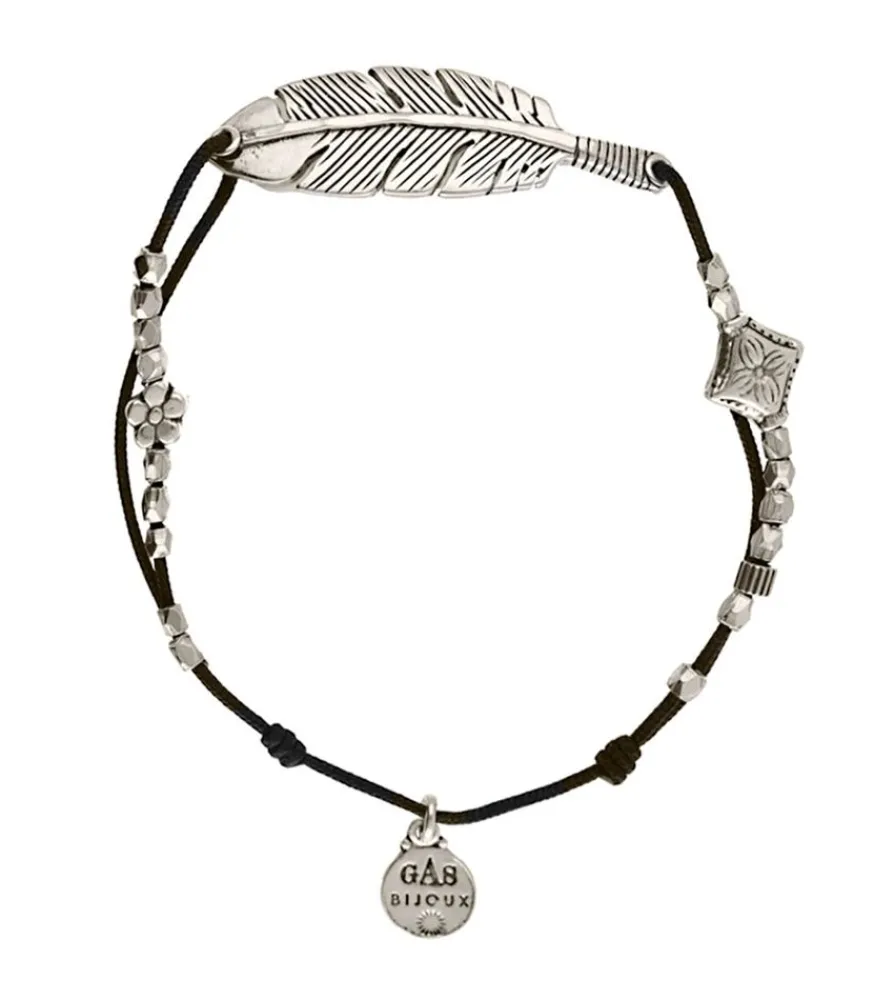 Bracelet Penna Signé Gas Bijoux, Composé D’Un Lien En Coton Tressé Et D’Empiècements En Métal Argenté : Petites Perles, Breloques, Fleurs Et Grande Plume Au Centre.