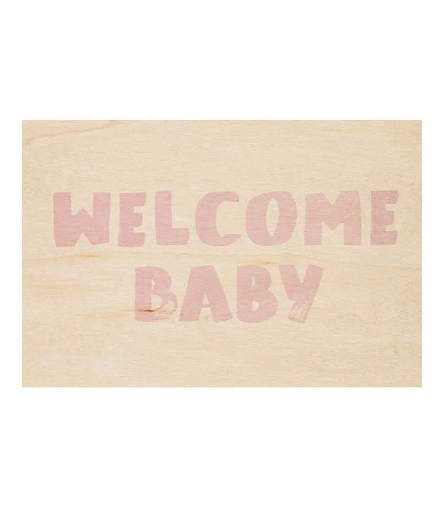 Carte Postale En Bois De La Marque Woodhi, Inscription « Welcome Baby » En Rose Façon Aquarelle. Une Idée Originale Pour Féliciter Des Proches Pour L’Arrivée D’Un Bébé, Et Un Cadeau Qui Se Garde Dans Le Temps Grâce À Sa Matière Résistante Et Intemporelle Et Son Design Innovant.