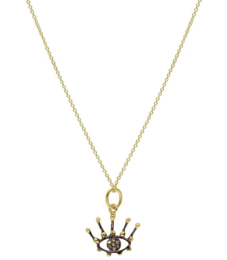 Collier Artie 5 Octobre, Une Pièce D’Exception Réalisée À La Main En Atelier, Entièrement Faite D’Argent Massif Noirci Et D’Or 14 Carats, Et Sertie De Diamants Champagne. Ce Collier 5 Octobre Se Compose D’Une Chaîne En Maille Forçat Dorée Ornée D’Un Pendentif En Forme D’Oeil, À La Fois Raffiné Et Espiègle.