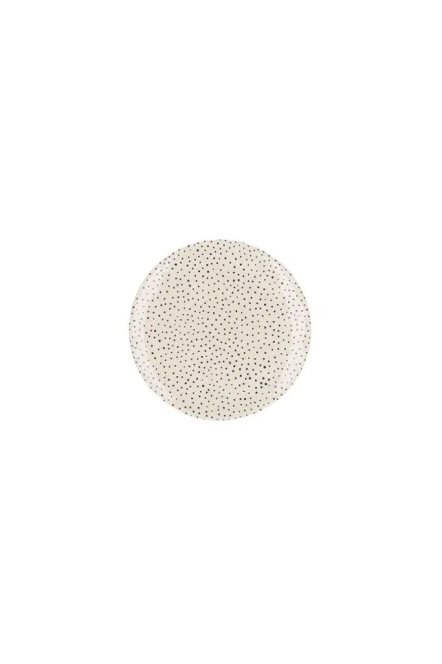 Petite Assiette En Céramique Beige Recouverte De Petits Pois Bleus.