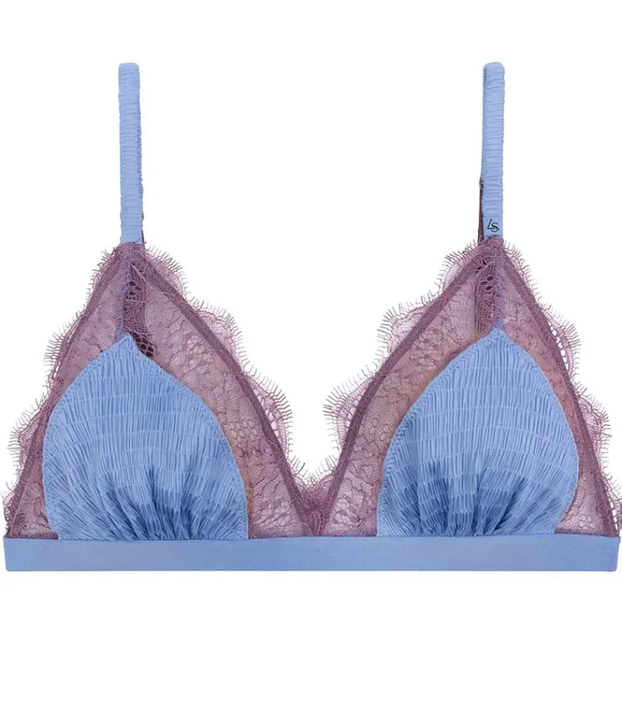 Soutien-Gorge Love Lace Blue Purple De La Marque Love Stories, Une Bralette Triangle En Tissu Ruché Qui Dévoile Un Jeu De Dentelle Frangée À Motif Floral De Couleur Pourpre. Maintien Léger, Bretelles Réglables Et Fermeture Réglable Avec Oeillet Et Une Agrafe.