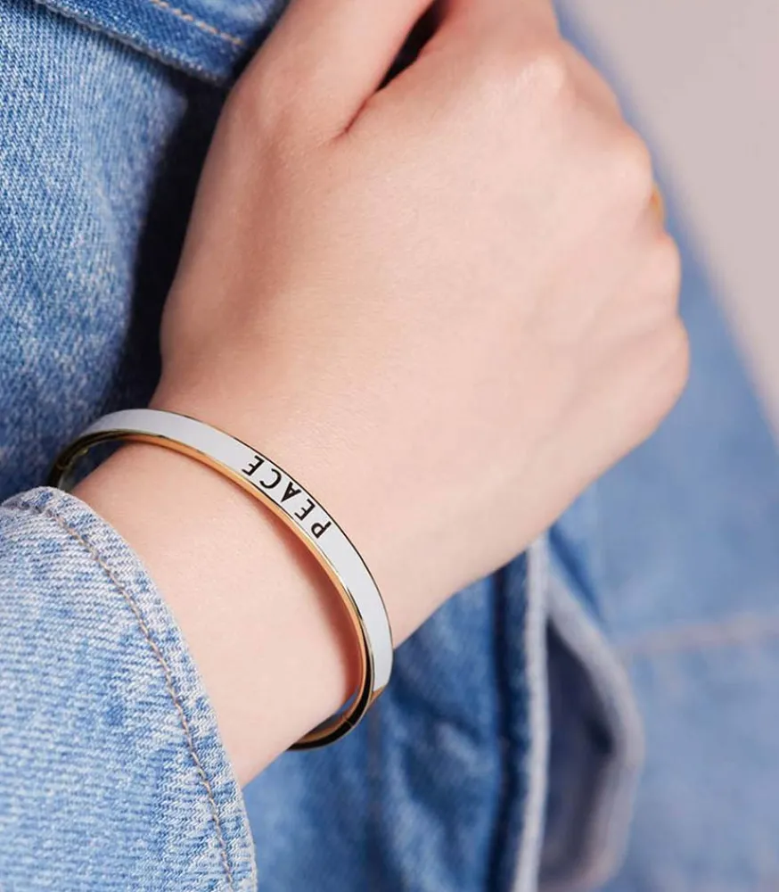 Bracelet Candy Word Peace Light Blue, Un Joli Jonc Fin Et Élégant En Acier Inoxydable Doré, Orné D’Émail Bleu Clair Doux. Il S’Orne Du Message « Peace » En Lettres Dorées, Véhiculant Un Message De Paix. Un Bijou Parfait À Porter En Accumulation Avec D’Autres Bracelets De La Marque Ou À Offrir Un À Proche.