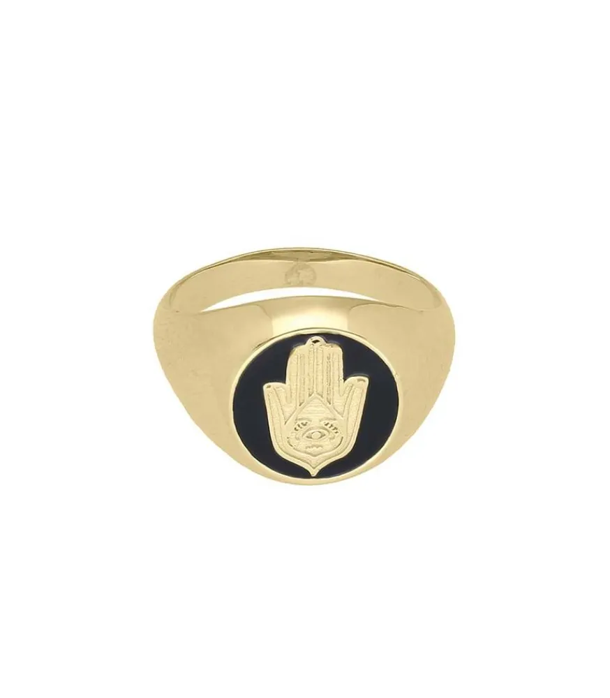 Chevalière Main De Fatma Feidt Paris, En Or Jaune 9 Carats Et Émail De Couleur. Symoble Main De Fatma Sur Le Dessus, Pour Une Pièce Pleine De Symbolique.