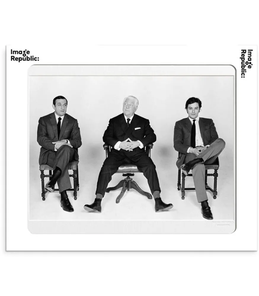 Affiche La Galerie Delon Gabin Ventura Le Clan Éditée Par Image Republic, Un Sobre Tirage En Noir Et Blanc Représentant Les Acteurs Principaux Du Film Le Clan Des Siciliens, Alain Delon, Jean Gabin Et Lino Ventura, Assis Côte À Côte.