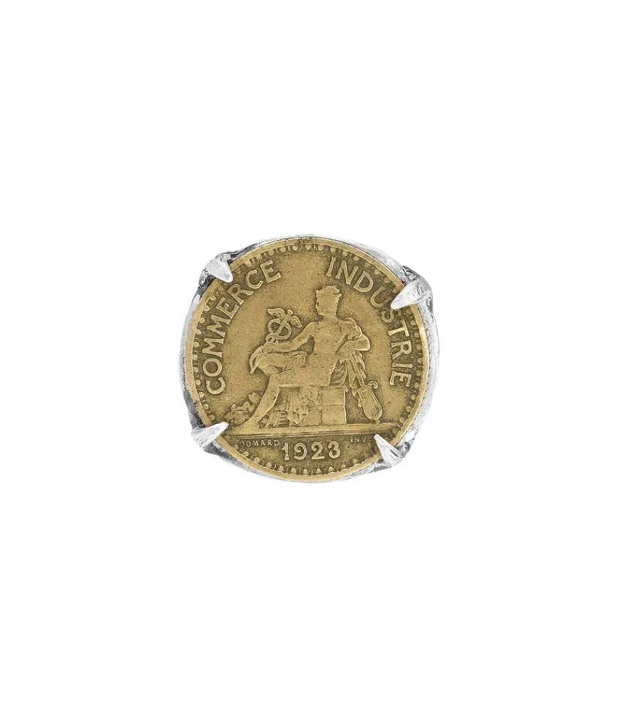Bague Pièce « Commerce Industrie » De La Marque Roc Paris. Ce Bijou Fait Main Comprend Une Monture En Argent 925 Surmontée D’Une Pièce Authentique De Un Franc De La Chambre De Commerce (Années 20).