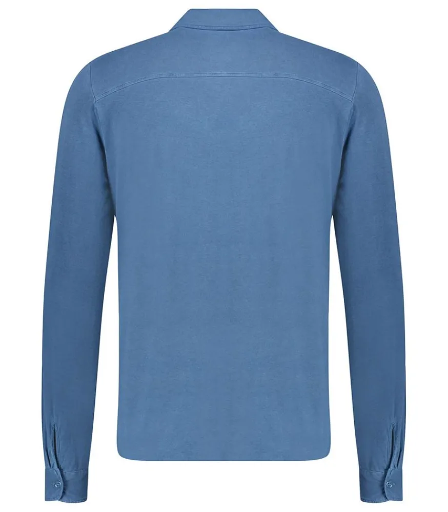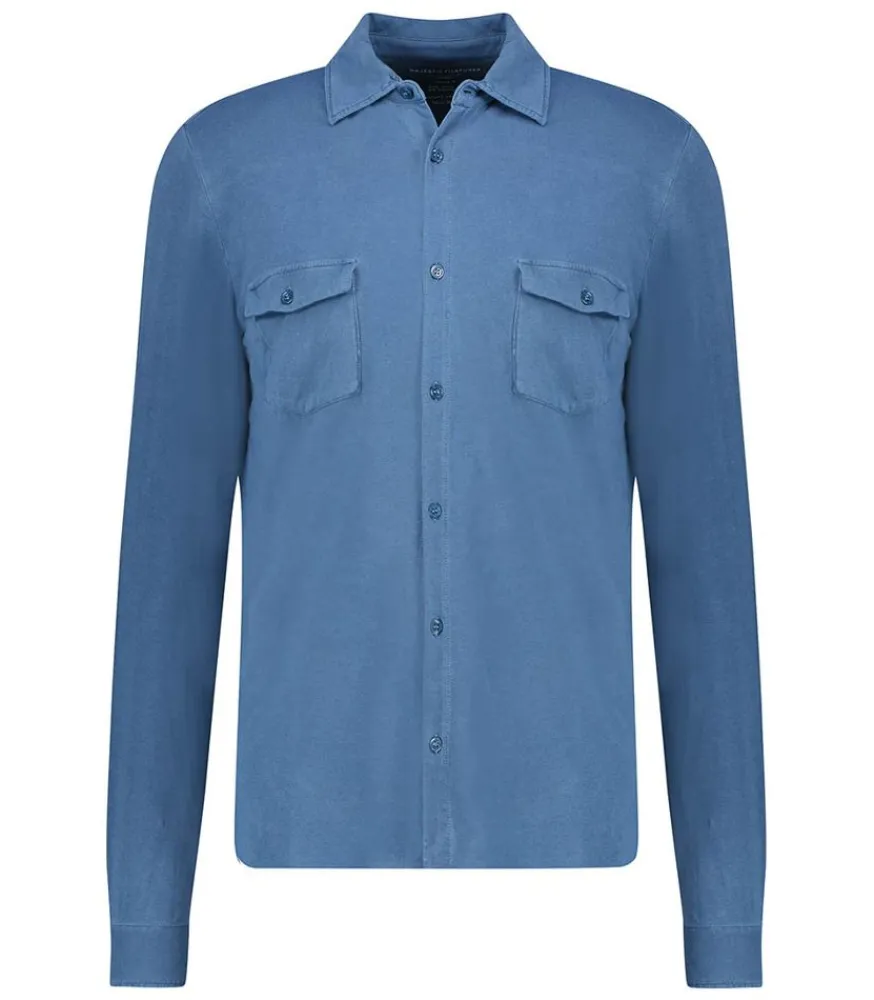 Chemise Manches Longues Homme Haute Mer Signée Majestic Filatures. Une Pièce À L’Esprit Casual Avec Sa Matière En Coton Doux Effet Peau De Pêche, Sa Touche D’Élasthanne Pour Le Confort Et Ses Deux Petites Poches À Rabats À La Poitrine. Coloris Crépuscule Issu De La Collection Aw23, Un Bleu Gris Foncé Très Masculin.