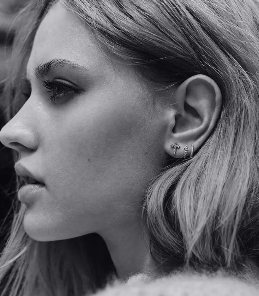 Stone Paris Signe Cette Mini Créole Double Glory En Or Noir Et Diamants. Elle Se Compose De Deux Anneaux, Un Simplement Pavé De Diamants Et Un Travaillé En Forme D’Arabesques Pavées De Diamants. Sa Construction Est Pensée Pour Se Porter Sur L’Oreille Droite, L’Attache Pour L’Oreille Étant Positionnée Au Niveau Du Motif En Arabesques.
