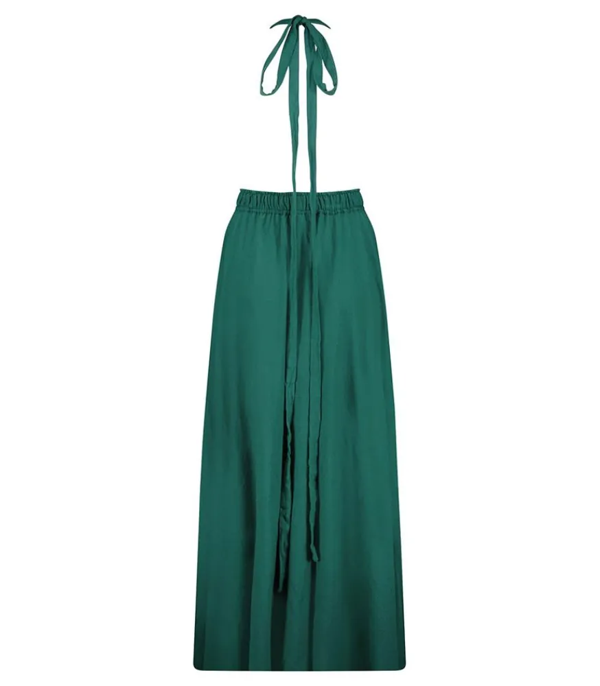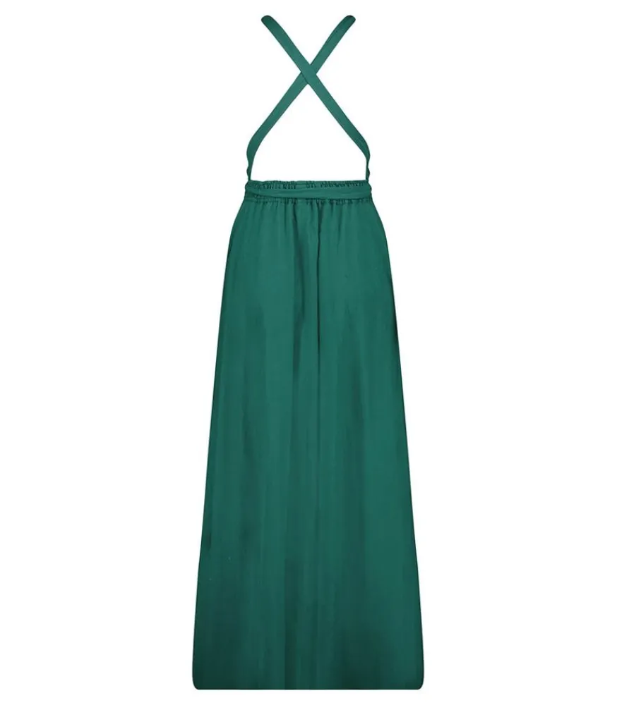 Robe Longue Hera Dans Un Coloris Alpine Green Signée Caravana. D’Inspiration Divine Et Antique, Cette Robe Aérienne Dévoile Un Profond Décolleté Ainsi Qu’Un Dos Nu Traversé Par De Fines Bretelles Venant Se Nouer De Différentes Façons.
