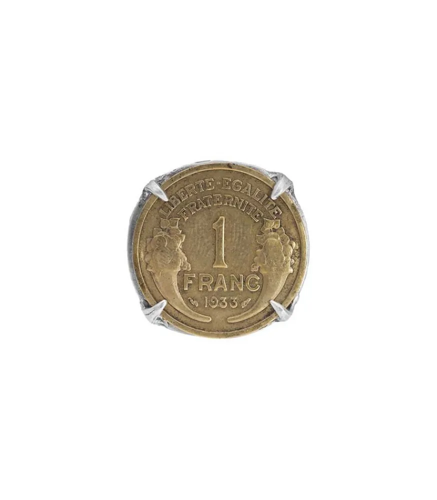 Bague Pièce « 1 Franc » De La Marque De Bijoux Roc Paris. Ce Bijou Fait Main Est Constitué D’Un Anneau En Argent 925 Surmonté D’Un Plateau Dans Lequel Est Incrusté Une Pièce Authentique De Un Franc Morlon Des Années 30.