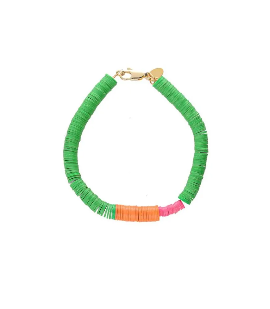 Bracelet Hawaii De La Marque Maison Mönik. Il Se Compose De Perles Vertes Et Oranges En Vinyle Recyclé Associées À De Plus Petites Perles De Couleur Rose Qui Confèrent À La Création Un Certain Dynamisme.