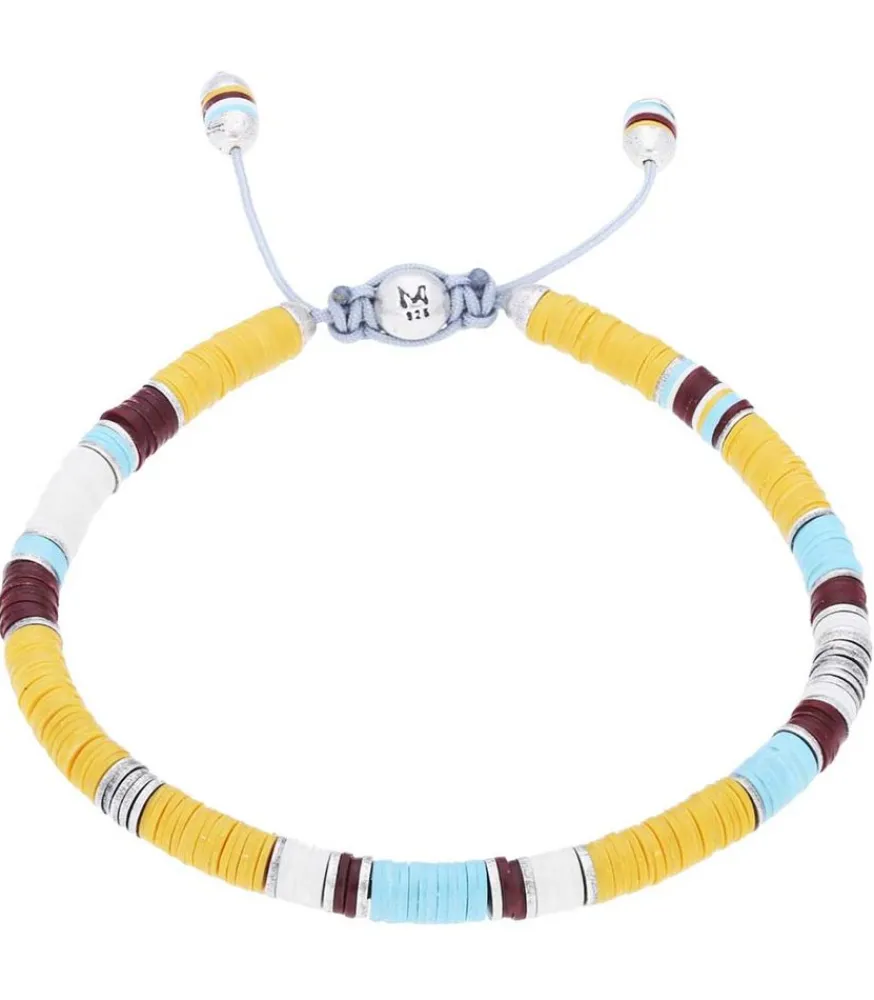 Bracelet The Boho M.Cohen Composé De Perles De Disques En Vinyl Africain Dans Des Tons De Jaune, Turquoise, Marron Et Blanc. 2 Versions Du Bracelets Sont Proposées Avec Des Compositions Différentes Suivant Les Alternances Des Perles De Couleur.