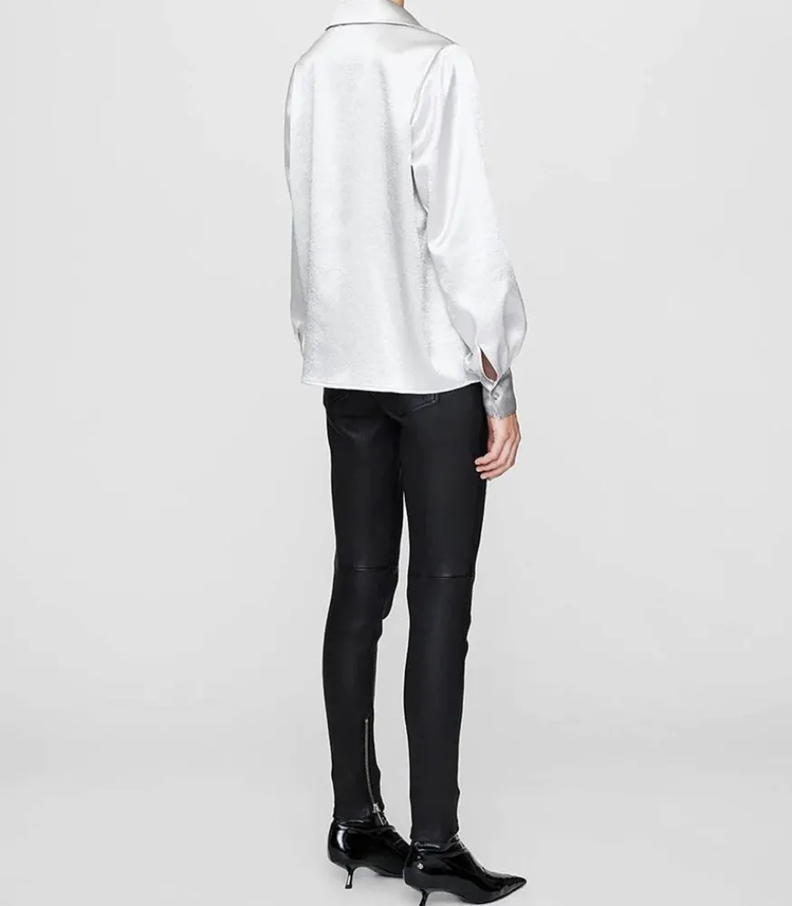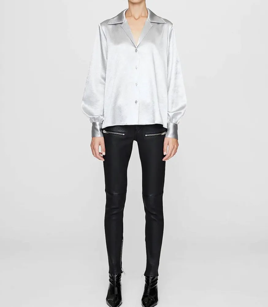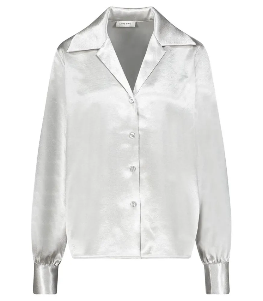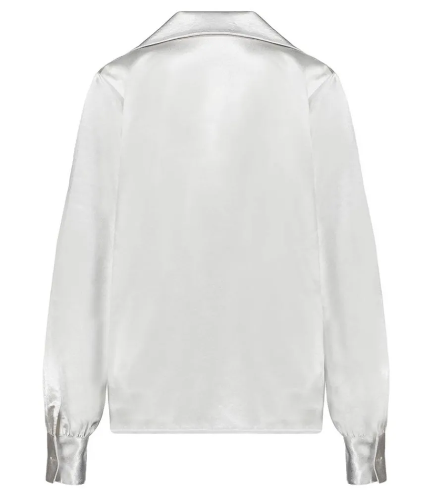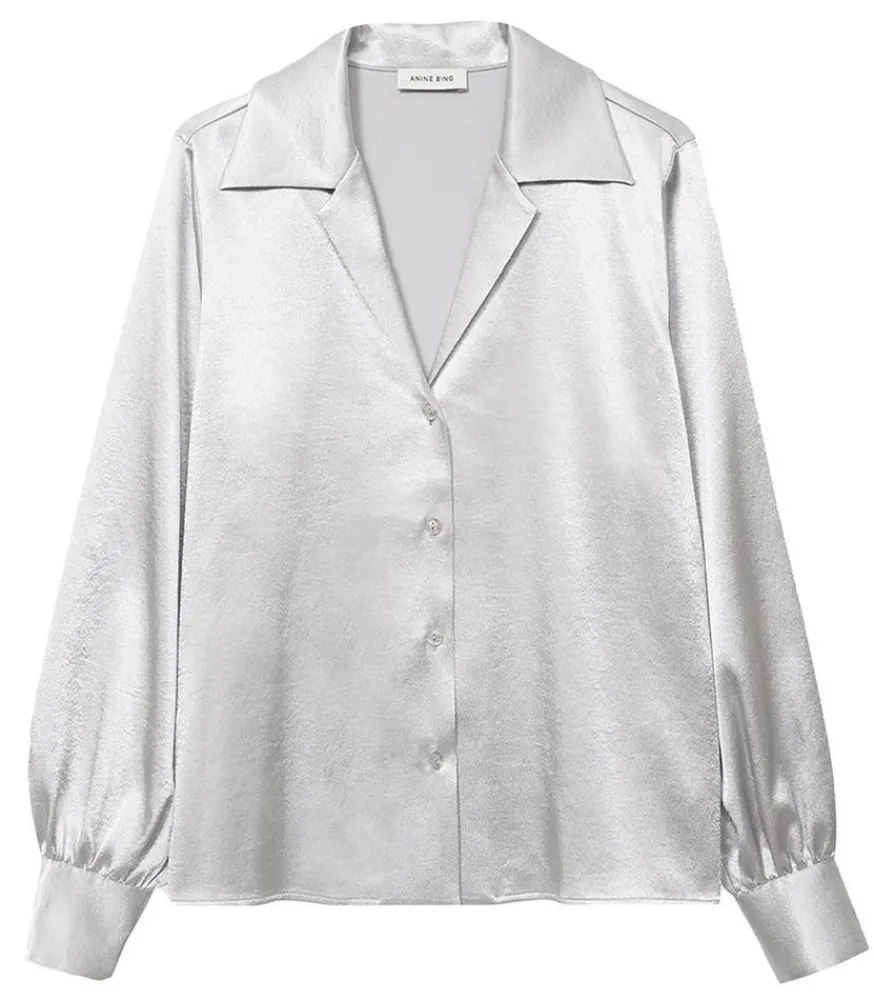 Découvrez La Chemise En Soie Mylah Silver De La Marque Anine Bing. Un Haut Boutonné, Confectionné À Partir De Polyester 100 % Recyclé. Il Offre Une Texture Veloutée Satinée Et Un Éclat Métallique Doux. La Chemise Mylah Se Distingue Par Son Col Pointu Généreux Et Ses Manches Blousons Qui Ajoutent Une Touche De Volume.