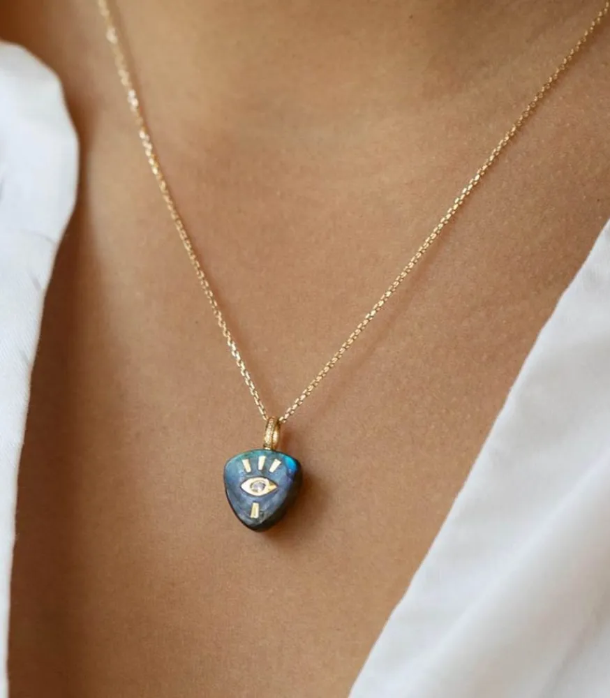 Collier En Or Chaîne Oeil Diamant Labradorite De La Créatrice Céline Daoust. Le Cristal De Labradorite Protège De La Négativité. Réel Collier Symbolique, Il Possède Une Pierre D’Intuition Et De Clairvoyance. On L’Apprécie Tout Particulièrement Pour Son Dégradé De Bleu, De Gris Et De Vert.