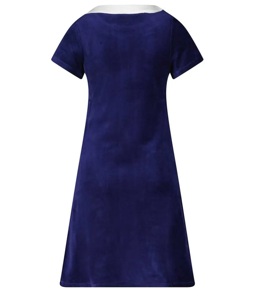 Ma Petite Plage S’Inspire De L’Iconique Diana Riggs Et Crée La Robe Diana En Velours Éponge. Son Coloris Bleu Nuit Est Traversé Par Une Large Bande Blanche Au Milieu De La Robe Jusqu’Au Col.