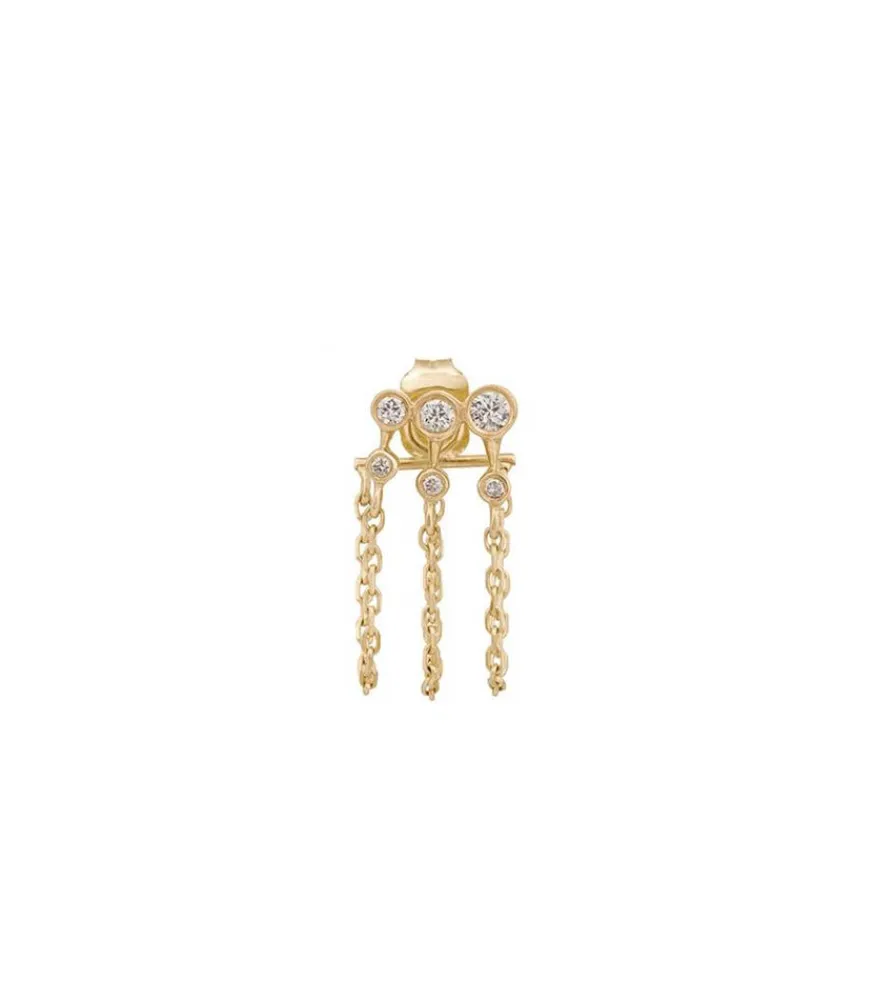 Boucle D’Oreille Unique Chaîne Constellations Triple Diamants De La Créatrice Céline Daoust. Une Pièce En Or Jaune Clair 14 Carats. Le Diamant Est Emblème De Pureté Et D’Éternité.