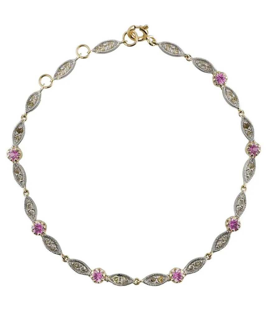 Bracelet Ava Saphir Rose Par Pascale Monvoisin, Un Délicat Bijou Conçu En Or Jaune Qui Dévoile D’Élégants Saphirs Roses Séparés Par Des Ovales Sertis De Diamants. Un Bijou Discret Qui Accompagnera Vos Montres Ou S’Intègreront À Vos Compositions De Bracelets.