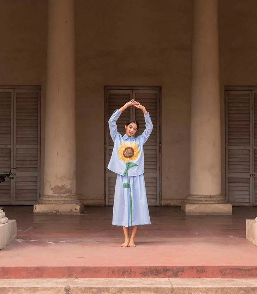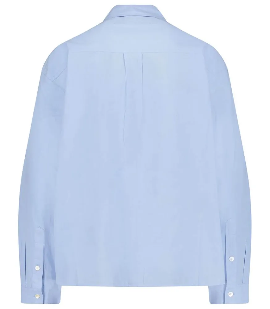 Chemise Alma Tournesol Ciel De La Marque Mii, Confectionnée En Popeline De Coton Légère Et Agréable À Porter. Son Design Sur Une Base Bleue Ciel Rappelle Les Chemise Piquées À Nos Hommes, Mais La Coupe Est Plus Ample Pour Une Touche Féminine. Un Tournesol Xxl Brodé À La Main À L’Avant Apporte Gaité Et Couleur.