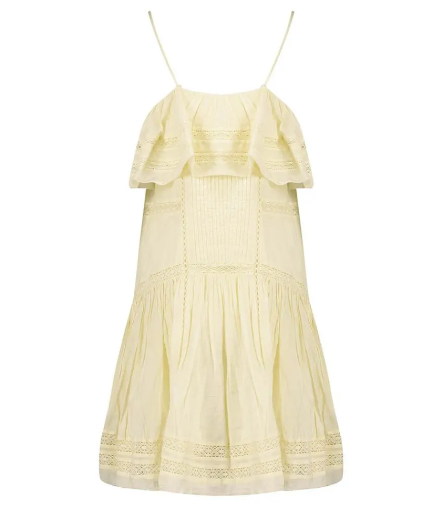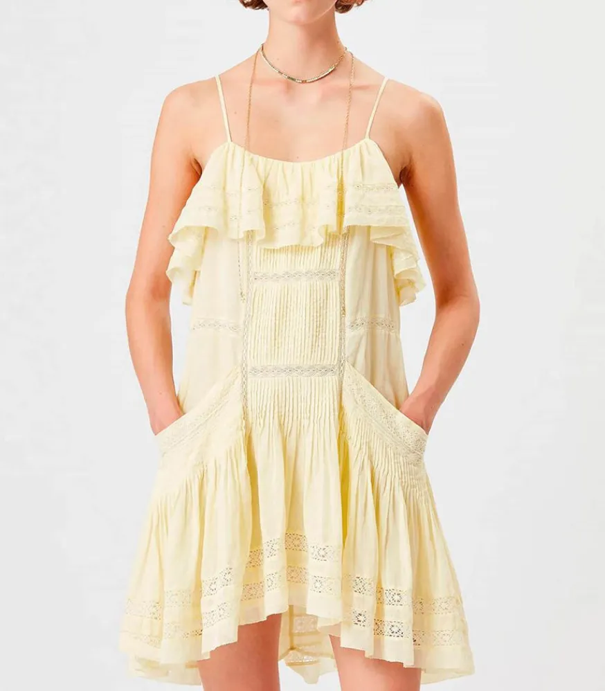 Petite Robe D’Été En Coton Moly Yellow Signée Isabel Marant, Un Modèle Trés Féminin Avec Ses Bretelles Spaghetti, Empreint D’Un Charme Bohème Avec Ses Multiples Volants Et Broderies À L’Anglaise.