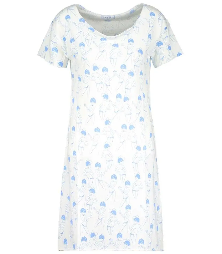 Robe Tee-Shirt Blue Girl G.Kero, Un Modèle Casual & Fun Agrémenté De Dessins Griffonnée D’Une Jeune Fille Dénudée Qui Prend La Pose Tel Une Icone Mode, Avec Sa Coupe À La Garçonne. Réalisée En Exclusivité Pour Jane De Boy, Cette Robe Tee-Shirt G.Kero Fine Et Légère Se Porte À La Maison Pour Une Tenue Confortable Ou À La Plage Pour Un Simple Voile Léger Par Dessus Son Maillot. Voir La Taille Du Mannequin
