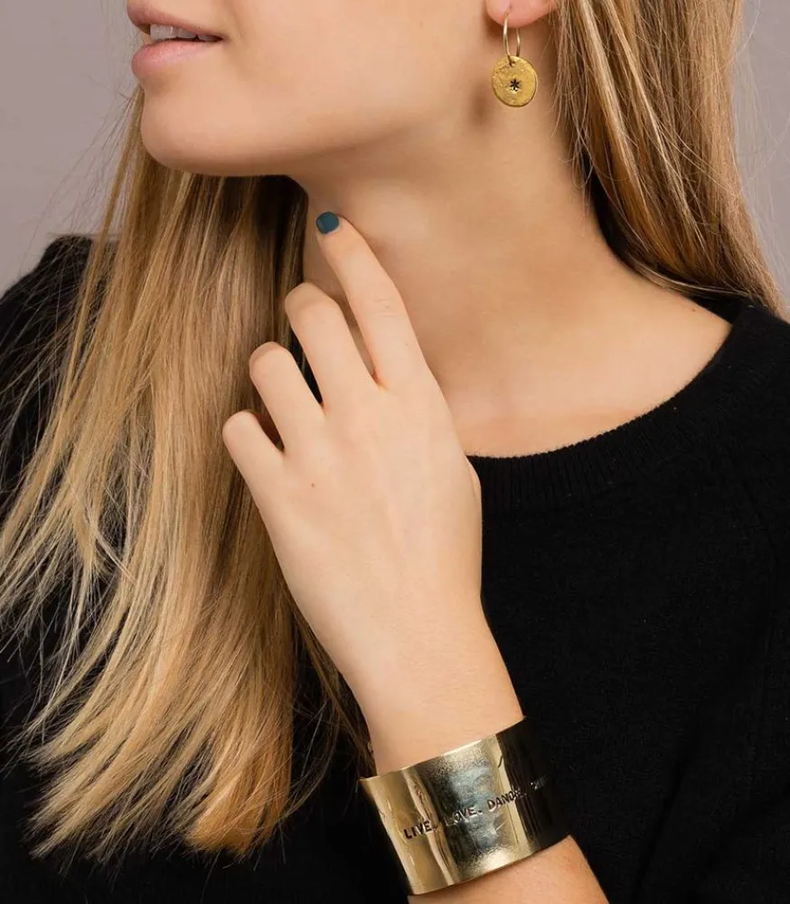 Atelier 7|12 Nous Rappelle Les Plaisirs Simples De La Vie Sur Cette Manchette Gravée « Live. Love. Dance. Smile, ». Fabriquée À La Main, Elle Est Réalisée En Laiton Doré Et Présente Une Finition Vintage Patinée, Qui En Fait Un Bijou Tendance.