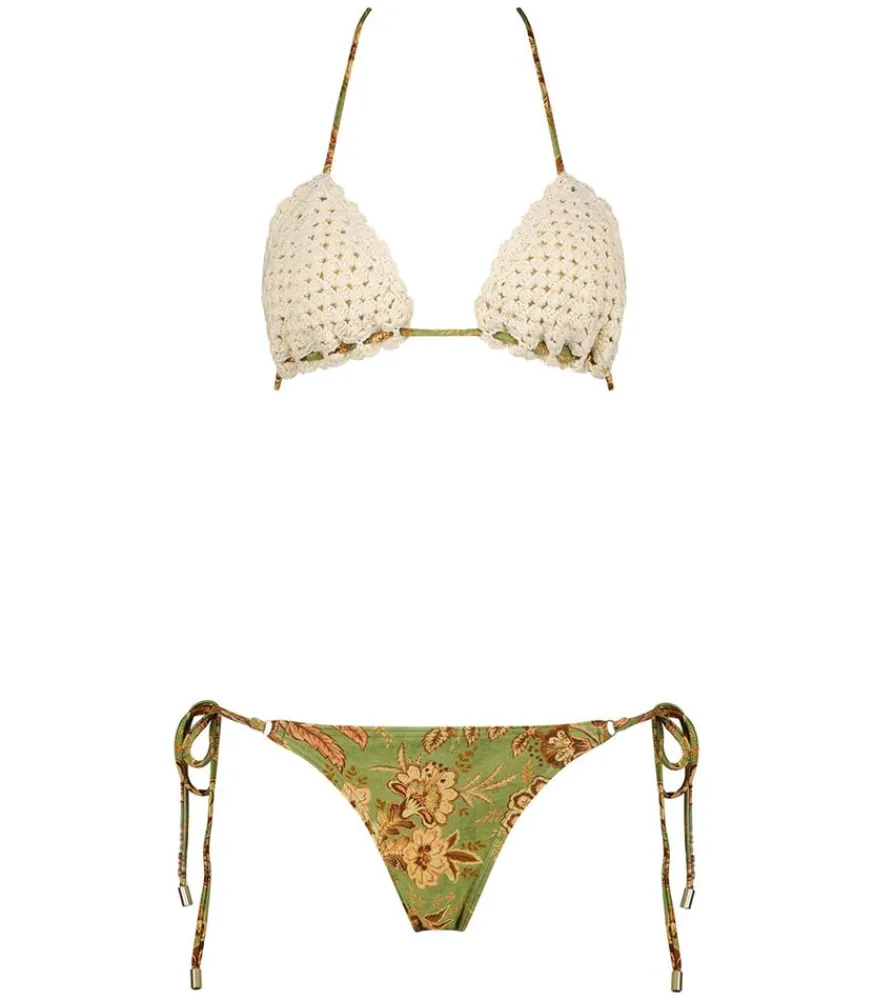 Découvrez L’Ensemble De Bikini Italien Confectionné En Lycra De La Marque Zimmermann, Comprenant Un Haut Triangle Orné De Chevrons Au Crochet Et Un Bas À Coupe Basse Avec Des Liens Latéraux.