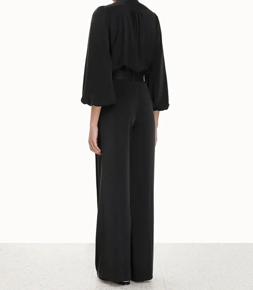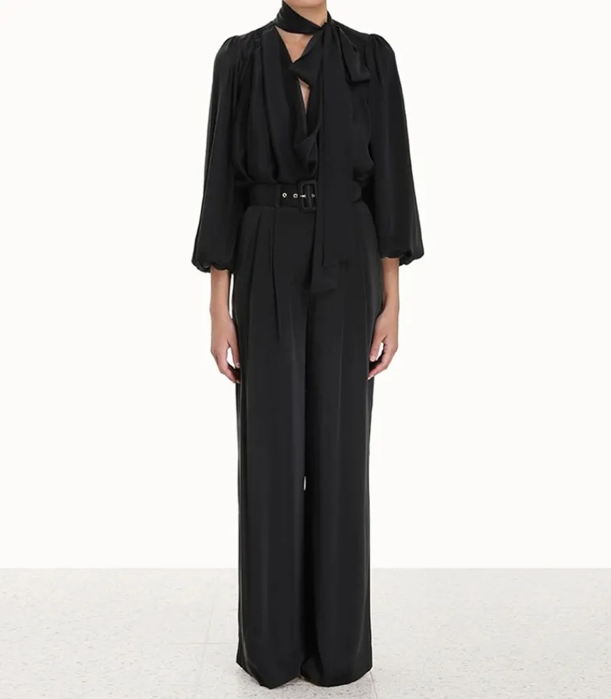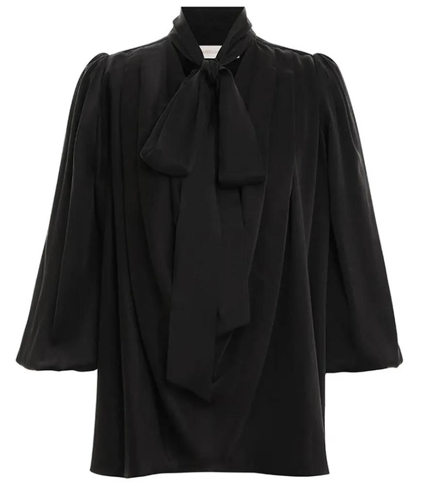 Blouse Silk Billow Black Signée Zimmermann, Entièrement Conçue En Soie. Très Élégante, Elle Est Parfaitement Adaptée À Une Tenue Du Soir Avec Sa Coupe Ample, Son Col Bénitier, Ses Plis Larges Et Ses Manches Bouffantes.