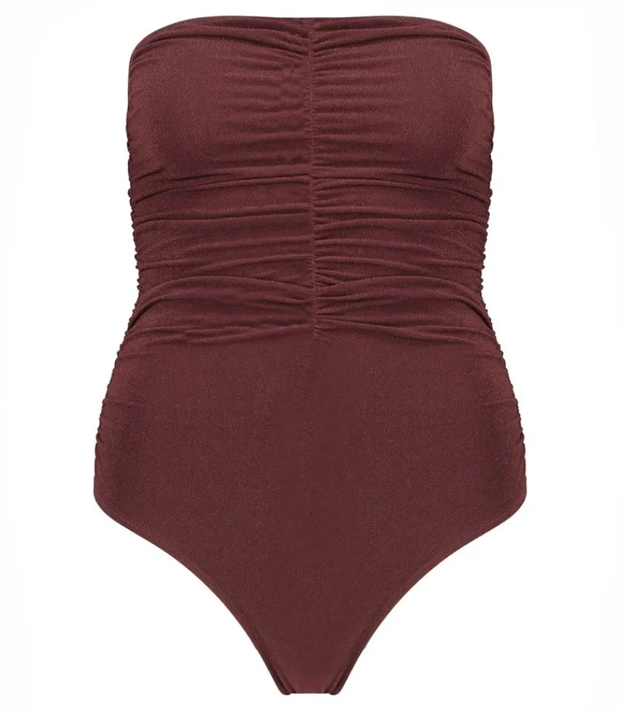 Maillot De Bain Une Pièce De Forme Bustier Signé Roseanna. Ce Modèle Ilhas Conçu En Matière Crèpe Élégante Aborde Un Coloris Cerise Profond.