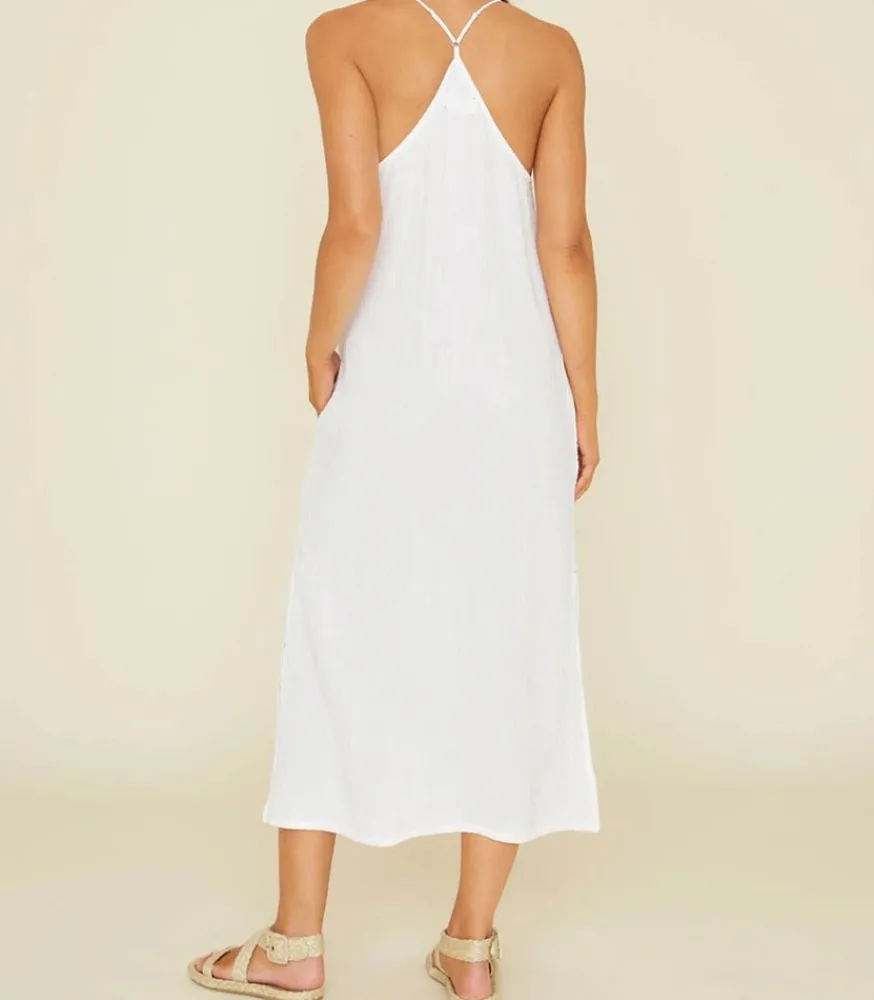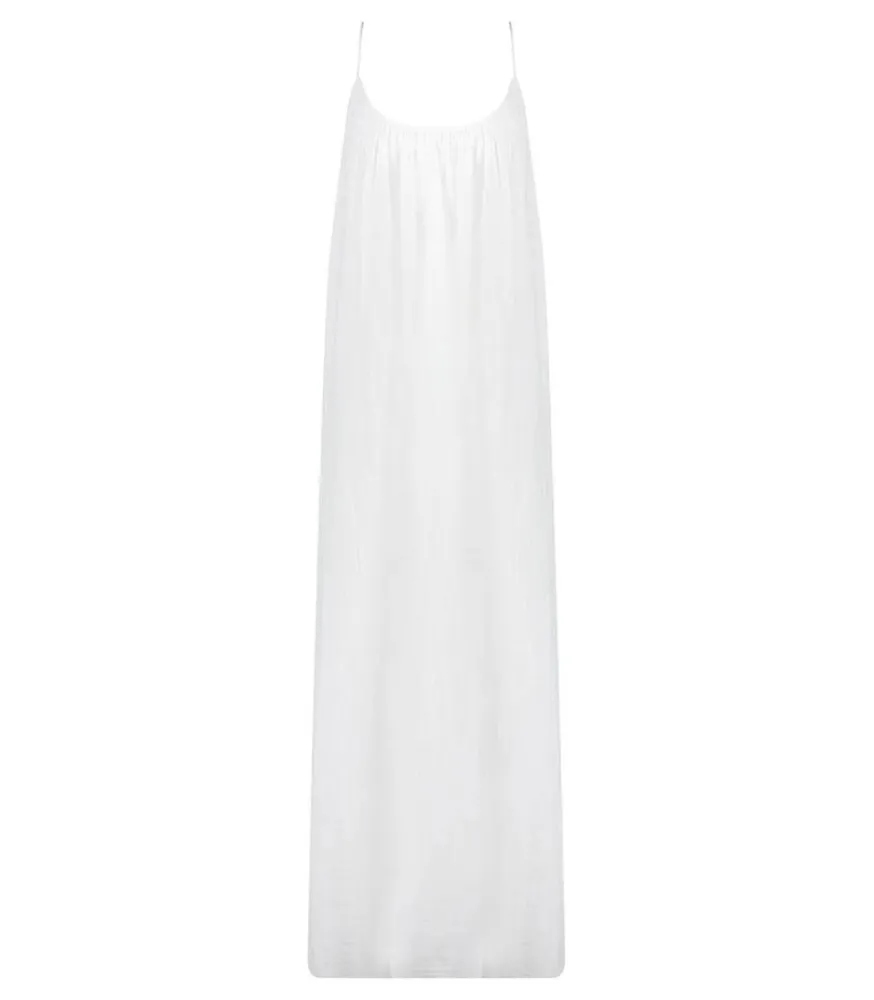 Robe Talia White De La Marque Xirena, Une Robe Longue Et Aérienne Conçue En Gaze De Coton Fluide Et Légère. Légèrement Froissée, Cette Robe Présente Un Col Rond, De Fines Bretelles Et Des Poches Latérales.