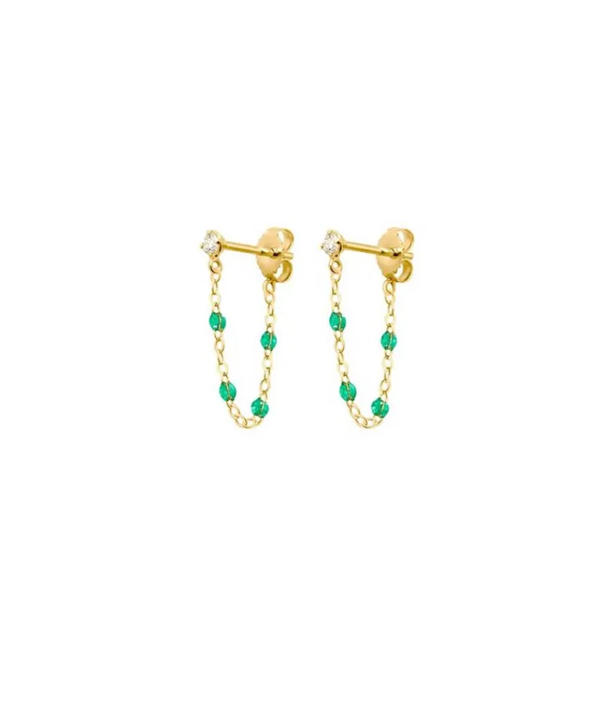 Toute L’Élégance Des Collections Gigi Clozeau Se Transcrit Dans Ces Boucles D’Oreilles Gigi Suprême En Or Jaune. Elles Présentent Une Petite Chaîne Pendante Fermée Telle Une Créole, Et S’Agrémentent De Petites Perles De Résine Colorée. Au Niveau De La Puce, Un Petit Diamant Blanc Apporte La Lumière Nécéssaire.