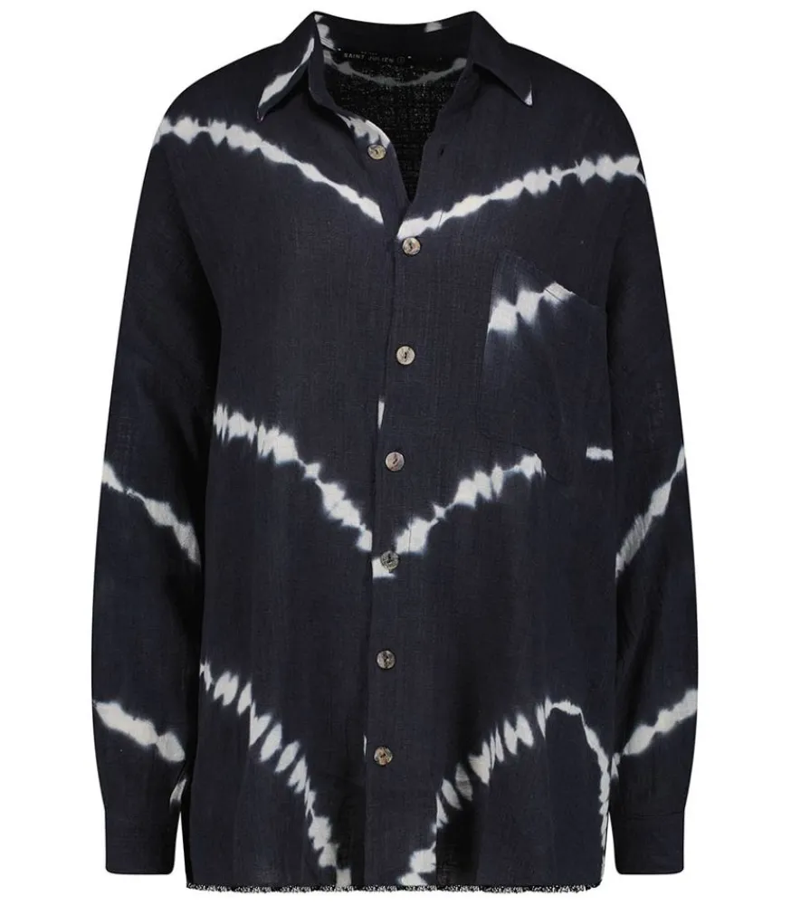 La Chemise Oversize Mykonos Tie & Dye Black Navy De La Marque Maison Saint Julien Offre Un Style Moderne Et Confortable. Avec Sa Coupe Mi-Longue Et Ses Épaules Tombantes, Elle Crée Une Silhouette Décontractée Et Fluide. Sa Finition Brute Lui Confère Un Aspect Naturel Et Authentique, Tandis Que Le Tissu Léger Et Respirant Avec Un Effet Transparent La Rend Idéale Pour Les Journées Chaudes. Les Boutons En Coquillage Naturel Ajoutent Une Touche Artisanale À Cette Pièce. Dans Une Teinte Noir Navy Intemporelle, Cette Chemise Invite À Une Liberté De Mouvement Fluide Et Gracieuse.