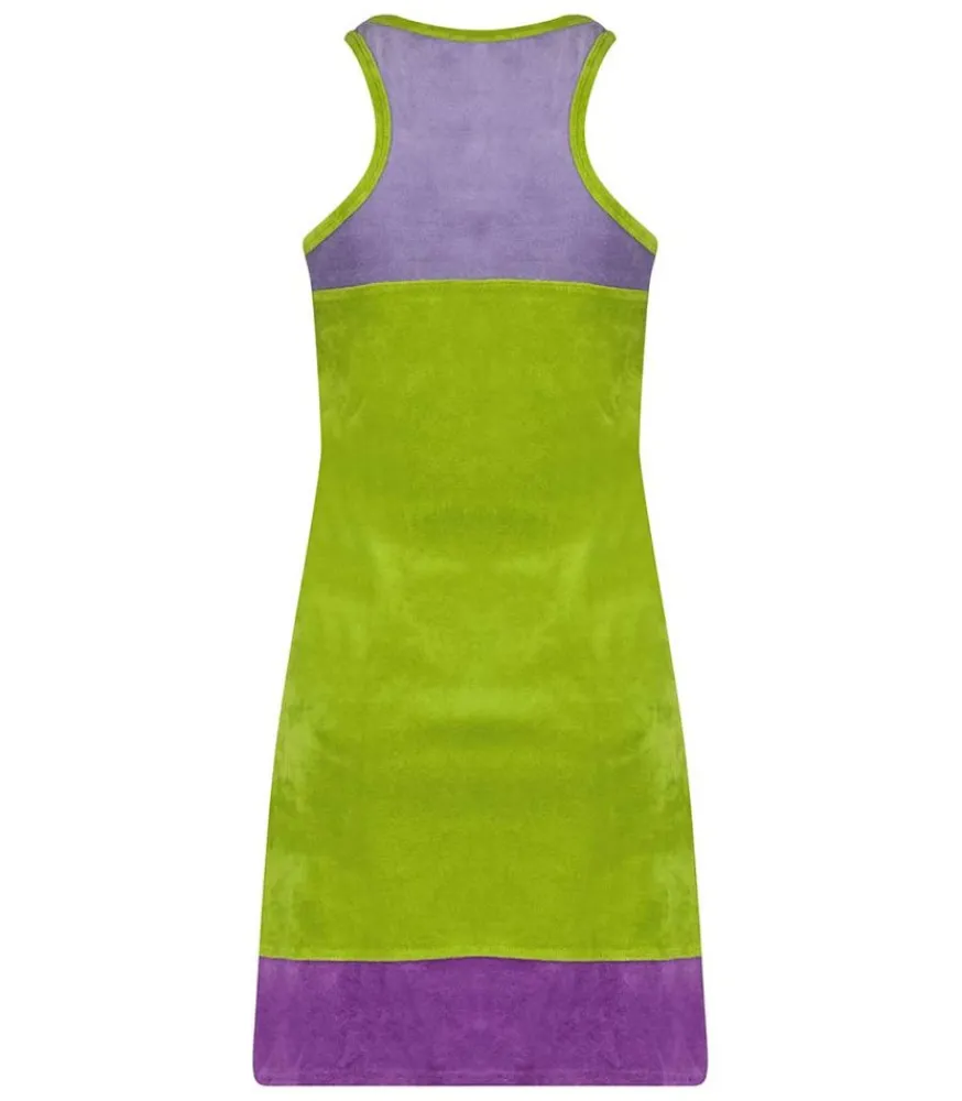 Robe Haydee Lavande & Olive De La Marque Ma Petite Plage. Majoritairement Verte Sur La Partie Centrale, Le Col Et Les Emmanchures, Ce Modèle Comprend Un Empiècement Lavande Sur Le Haut Et Le Bas De La Robe. Coupe Droite Sans Manche, Esprit 60S.