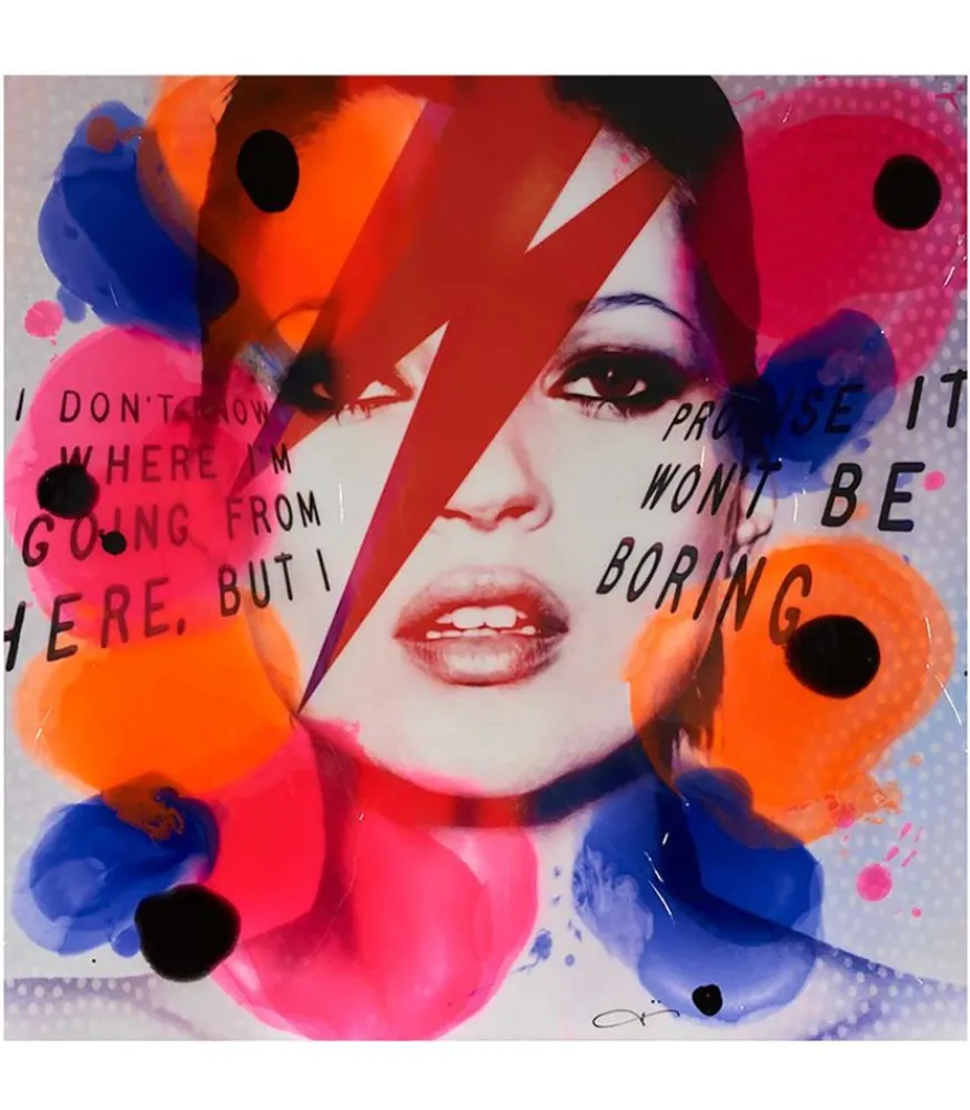 Tableau Jörg Döring « Promise » (2018) Composé D’Un Portrait De Kate Moss Retravaillée En Mixed Media : Peinture, Impression De Texte Et Résine Caractéristique De L’Artiste Pour Donner Du Relief Au Tableau Et Une Réaction Unique À La Lumière. Une Pièce Pleine De Caractère Avec Son Texte « I Don’T Know Where I’M Going From Here, But I Promise, It Won’T Be Boring » (« Je Ne Sais Pas Où Je Vais À Partir D’Ici, Mais Je Le Promets, Ça Ne Sera Pas Ennuyeux »).