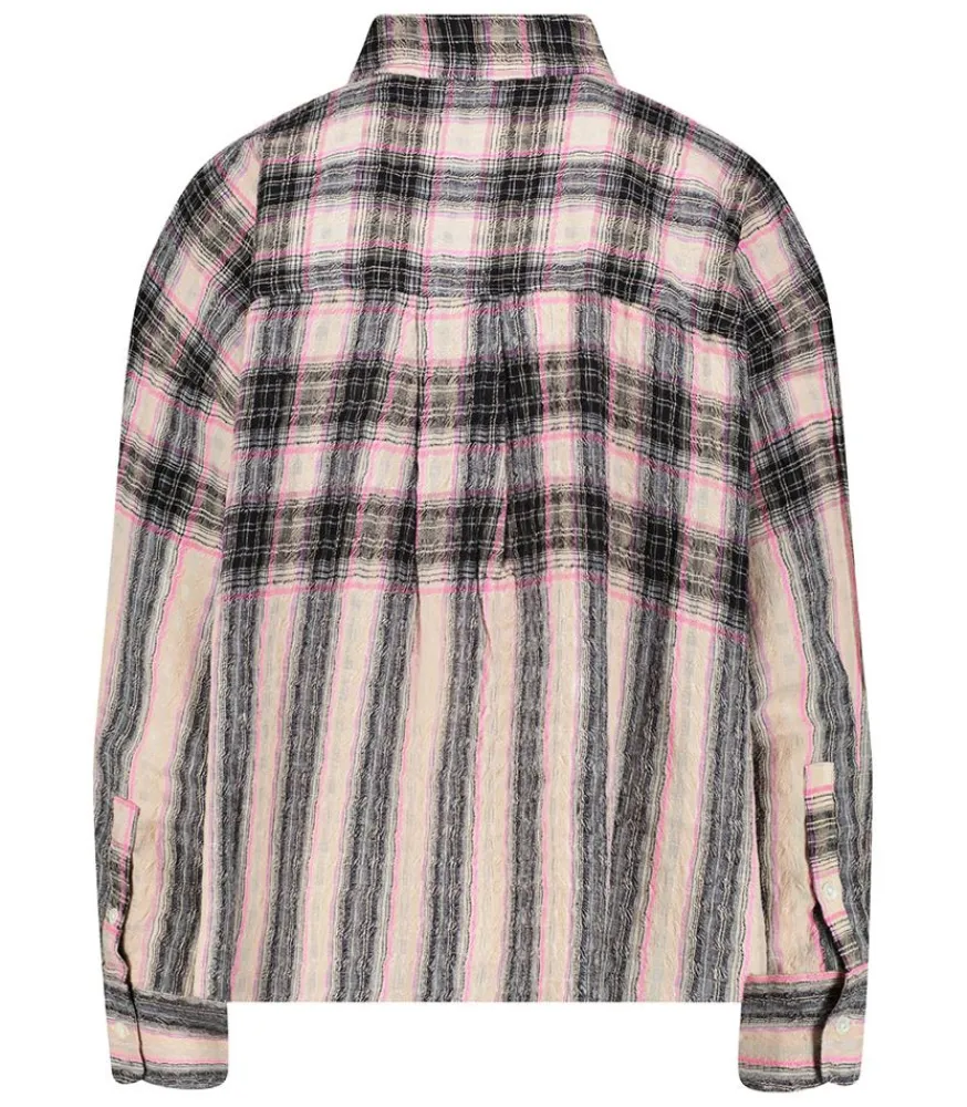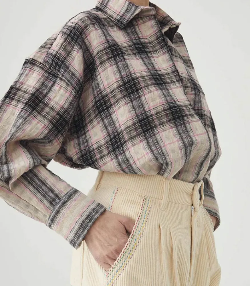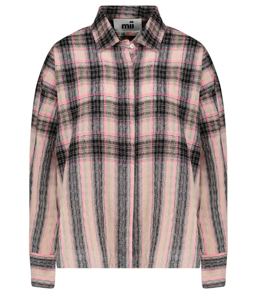 Chemise Angélina Beige De La Marque Mii. La Chemise Angelina Est Une Pièce Ample Qui Combine À La Perfection Légèreté Et Chaleur. Confectionnée À La Main À Partir D’Un Mélange De Laine Et De Coton, Son Motif À Carreaux Géométriques Et Graphiques Apporte Une Dimension Unique À Cette Création.