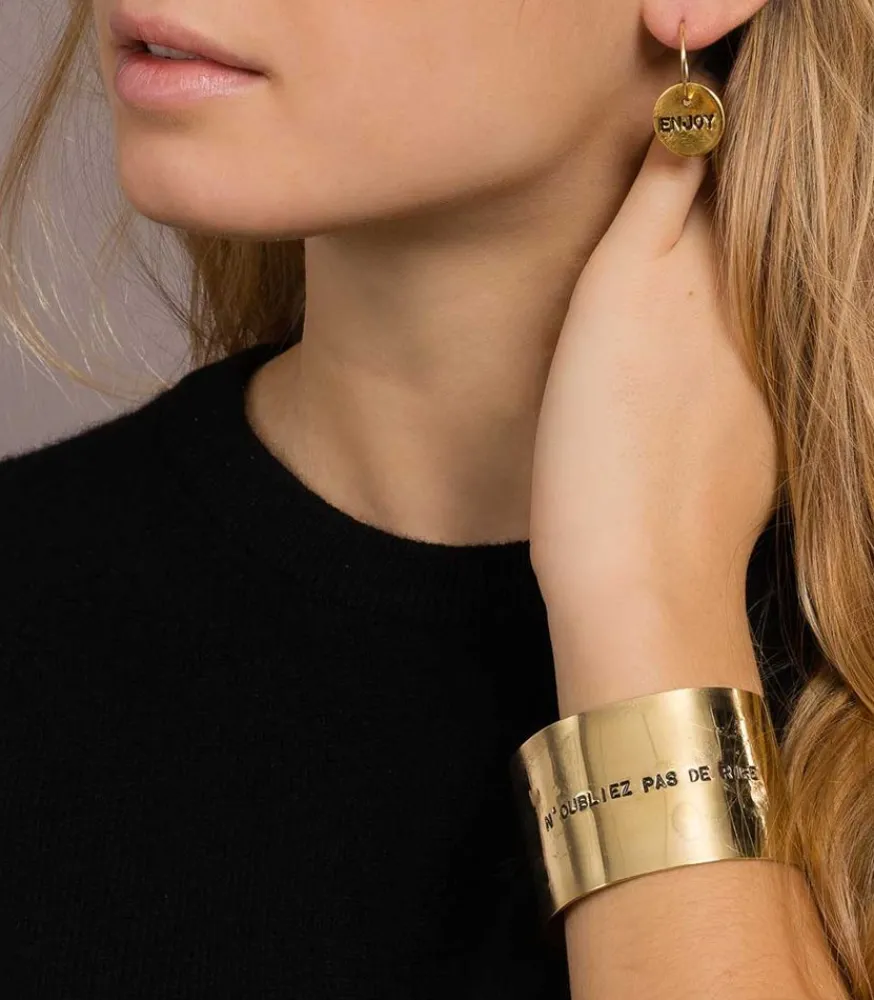Annalisa Morzone Pimente Les Créations De L’Atelier 7|12 De Phrases Et Expressions Malicieuses, Comme Sur Cette Manchette Gravée Du Mantra « N’Oubliez Pas De Rire ». On Retrouve Avec Plaisir Le Savoir-Faire Artisanal De La Maison Sur Ce Bracelet En Laiton Aux Accents Vintage.