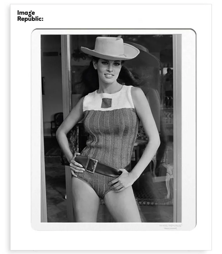 Affiche La Galerie Par Image Republic Reprenant Un Cliché En Noir Et Blanc De L’Actrice Américaine Raquel Welch Portant Un Chapeau Et Prenant La Pose. Accrochée Sur Le Mur D’Un Salon Ou D’Un Bureau, Cette Affiche Apporte À La Pièce Une Touche Rétro Et Élégante. Format 38 X 56 Cm.