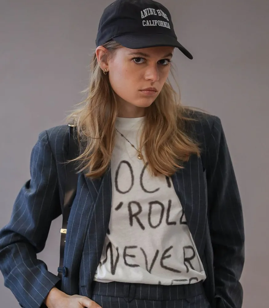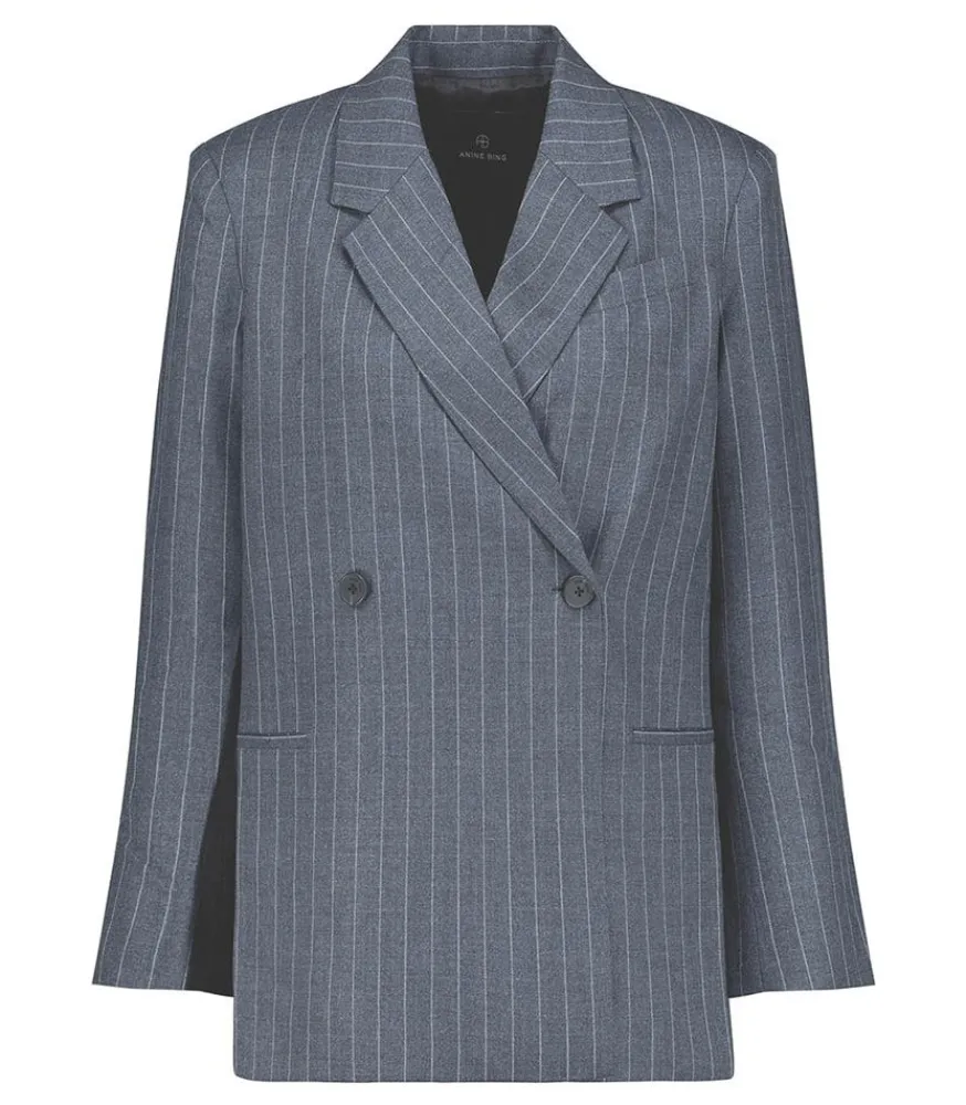 Blazer Kaia Grey Pinstripe De La Marque Anine Bing, Avec Une Belle Coupe Structurante Aux Épaules Marquées. Conçu Dans Un Mélange De Laine Italienne Légère, Il Est Entièrement Doublé Pour Plus De Confort Et Un Joli Tombé. Rayures Verticales Blanches Très Fines, Élégantes Et Formelles.