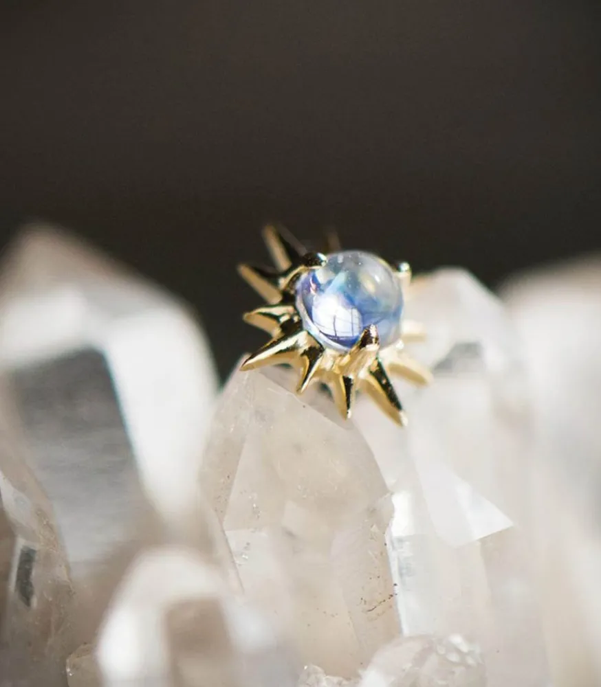 Boucles D’Oreilles Pierre De Lune Soleil De La Créatrice Céline Daoust. Une Paire De Boucles D’Oreilles Représentant Le Soleil Et Ses Vertus : Illumination, Force Et Clarté. La Pierre De Lune Est Reconnue Pour Équilibrer Les Émotions Et La Croissance Intérieure.