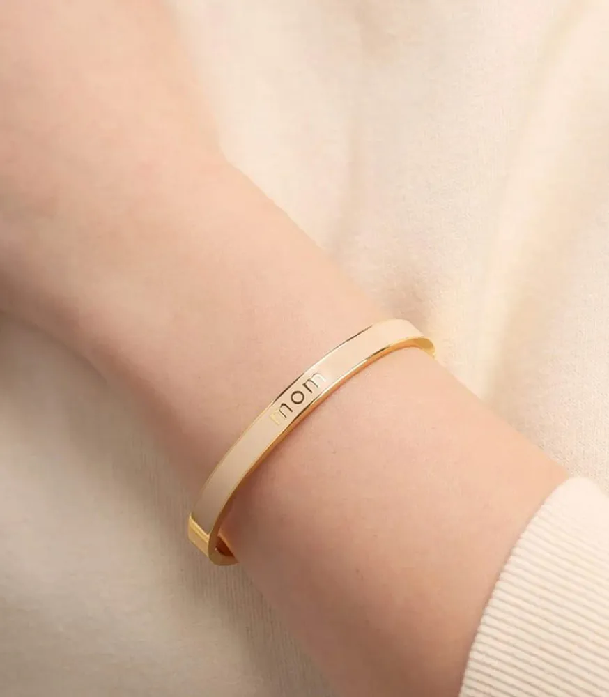 Bracelet Vip Word Mom Beige, Un Jonc Élégant Avec Sa Teinte Beige Et Dorée. Conçu En Acier Inoxydable, Il Traverse Les Épreuves Du Temps Pour Rester Brillant Le Plus Longtemps. Il Sera Parfait À Offrir À Un Proche Pour La Fête Des Mères Par Exemple.