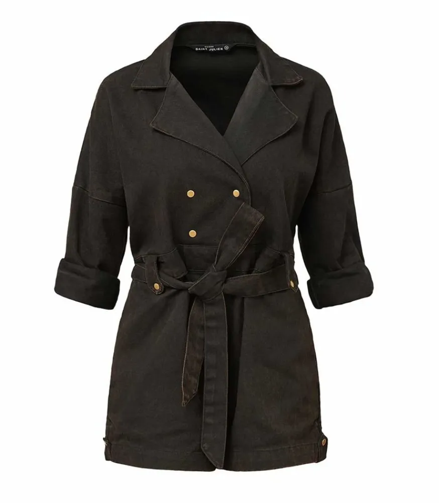 Maison Saint Julien S’Inspire Du Trench Et Crée Sa Combishort Trench Coat En Coloris Noir. Pourvu D’Une Taille Haute Ajustable, D’Épaules Tombantes En Denim Épais Et De Pattes De Boutonnage Permettant D’Ajuster Sa Longueur, Ce Modèle Est Croisé Sur Le Devant Avec Un Col Tailleur Et Une Ceinture À Nouer.