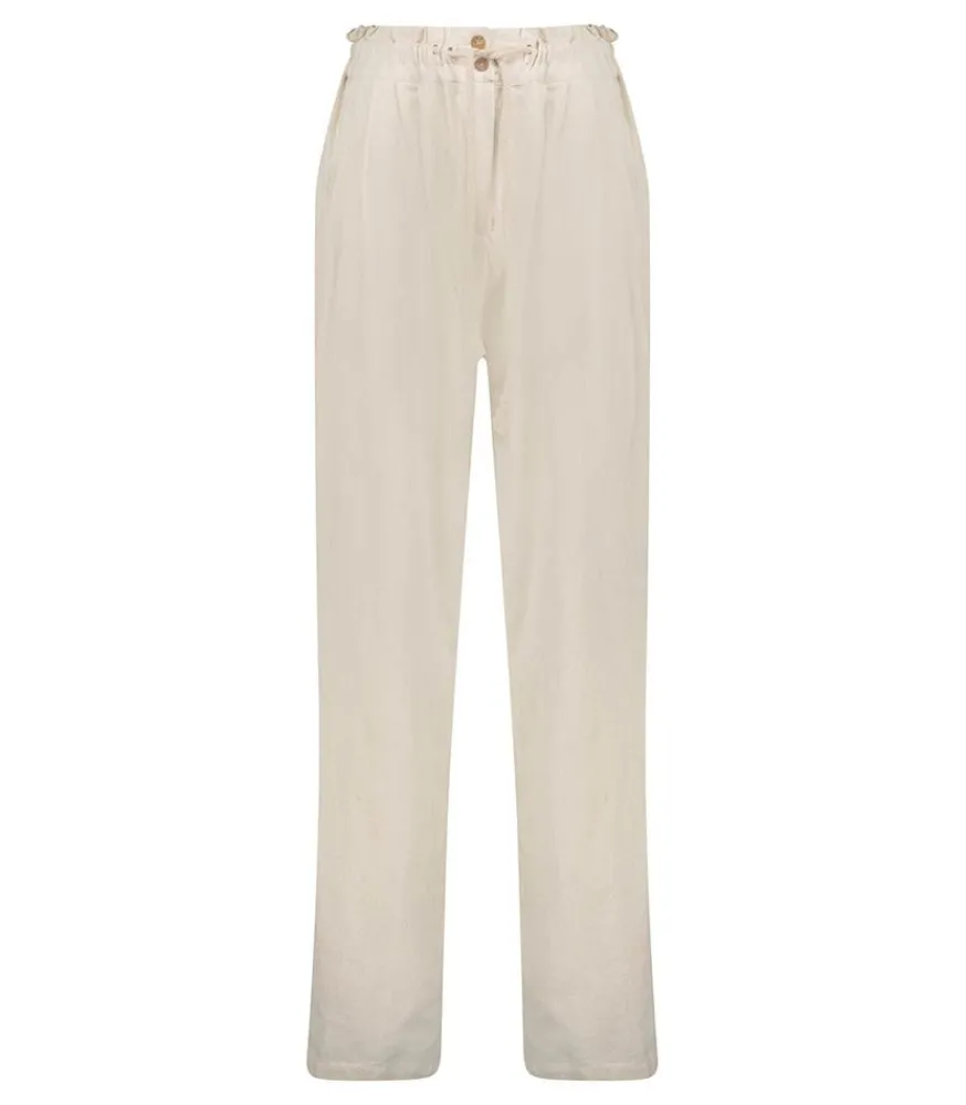Pantalon Cuba Libre Lin Naturel De La Marque Maison Saint Julien, Un Modèle Aérien Aux Accents Bohèmes Que L’On Associe Sobrement À Un Top Blanc Et À Une Paire De Sandales.