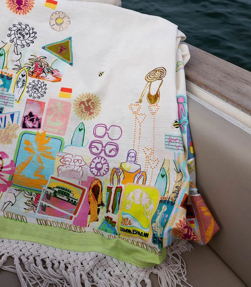 Fidèle À L’Esthétique De Sa Collection Resort Swim 2023, Zimmermann Signe Une Serviette De Plage Texturée À Patchs Et Franges Sur Les Bordures. Ses Couleurs Douces Et Son Imprimé Représentant Un Collage En Font Une Pièce À La Fois Design Et Fonctionnelle.