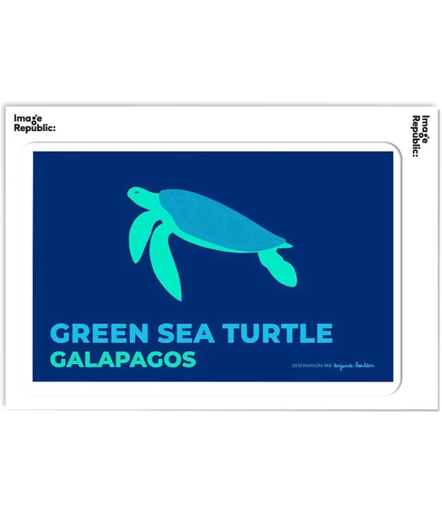 Affiche Galapagos Issue De La Collection Destination Par Anjuna Boutan Pour La Marque Image Republic. Symbole De L’Archipel, Une Illustration De Tortue Vient Contraster Le Fond Bleu Roi De Cette Affiche, Accompagnée Des Inscriptions « Green Sea Turtle » Et « Galapagos » Dans Les Mêmes Teintes.