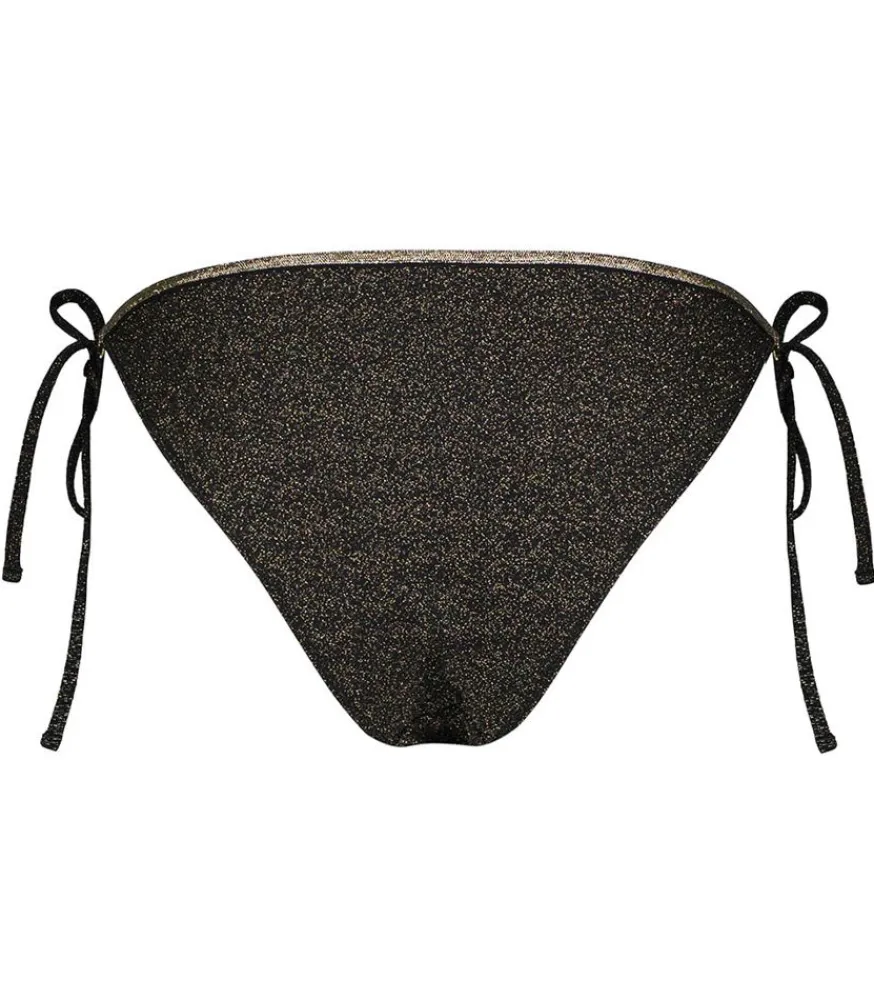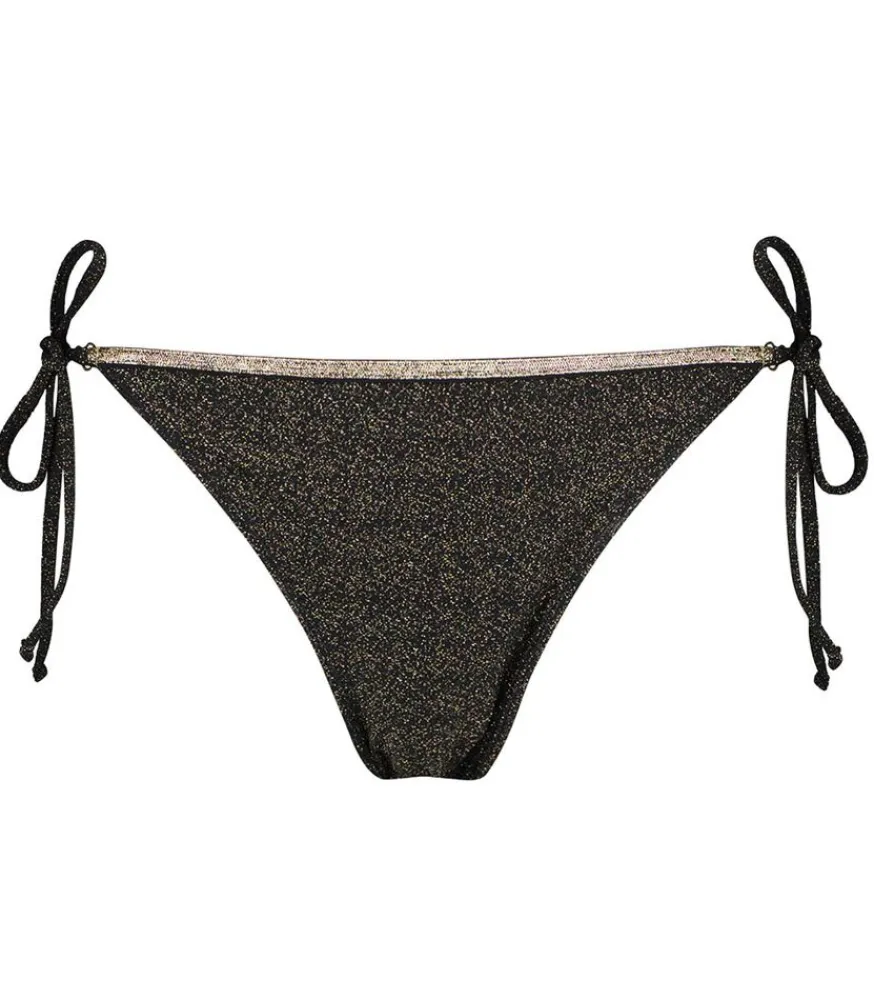 Bas De Bikini Laura Sparkling Black Signé La Nouvelle, De Forme Classique Et Échancrée, Et Conçue Avec Un Tissus Noir Lurex Et Liseré Doré. Liens À Nouer Sur Les Côtés Pour Une Touche Féminine.