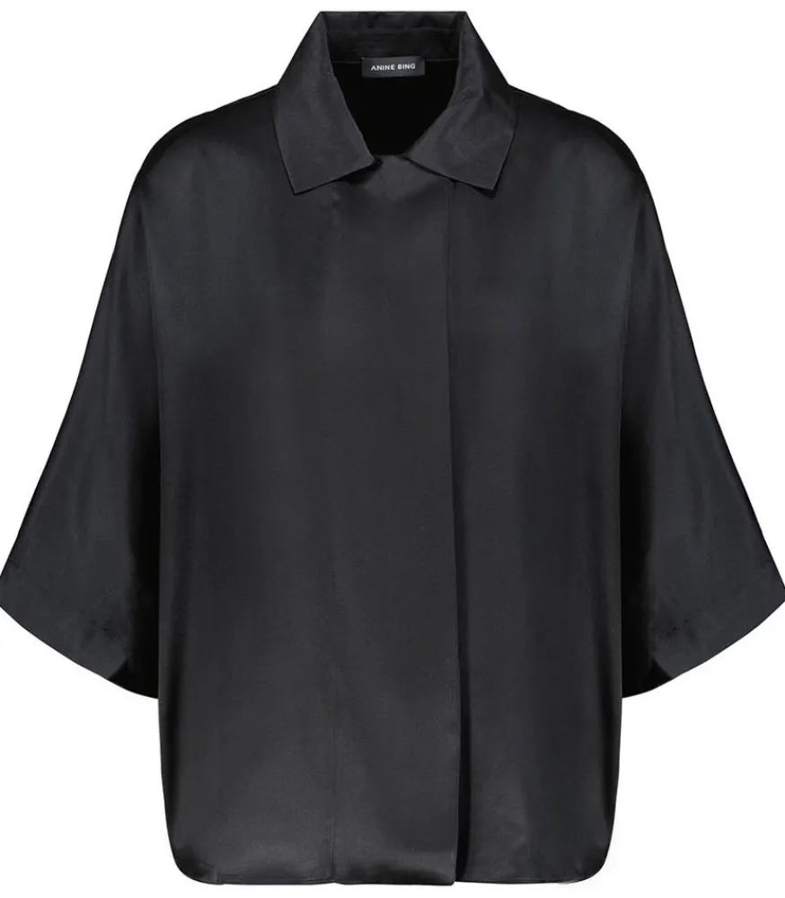 Chemisier Julia Noir De La Marque Anine Bing, À La Coupe Loose Et Élégante Avec Des Manches À Volume, Un Col Classique Ainsi Qu’Une Fermeture Boutonnée Et Camouflée Devant, Imitant Une Cravate Souple. Manches Coudes Évasées Pour Un Joli Effet Voile. Voir La Taille Du Mannequin