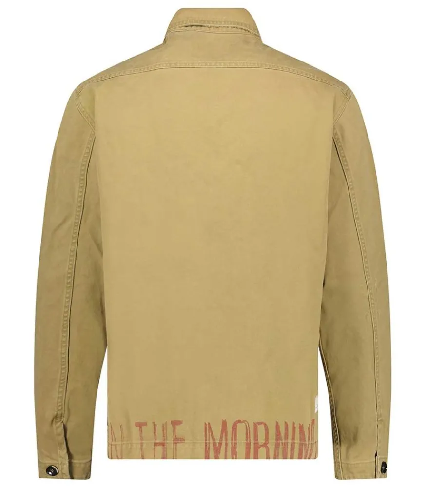 Veste En Toile Épaisse Pour Homme Andrea Camel De La Marque Nine In The Morning, En Coton Camel Rigide Esprit Workwear, Coupe Droite Avec L’Inscription « Nine In The Morning » En Rouge En Bas À L’Arrière De La Veste.