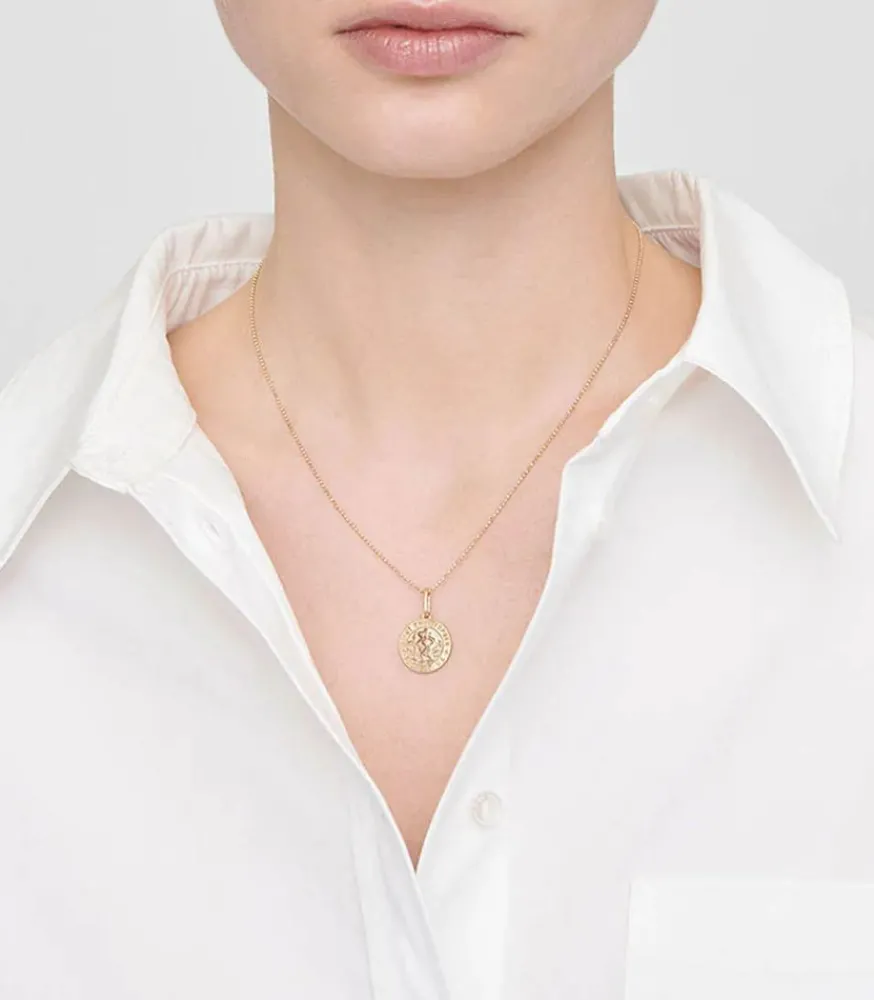 Pendentif Petite Médaille Ronde En Or Fabriquée À La Main Et Représentant Saint Christophe Avec Les Inscriptions « Saint Christopher – Protect Us » Sur Son Contour. Parfait Sur Une Chaîne, Il Offre Un Design Vintage À Vos Compositions De Bijoux Et En Fait Une Pièce Intemporelle.