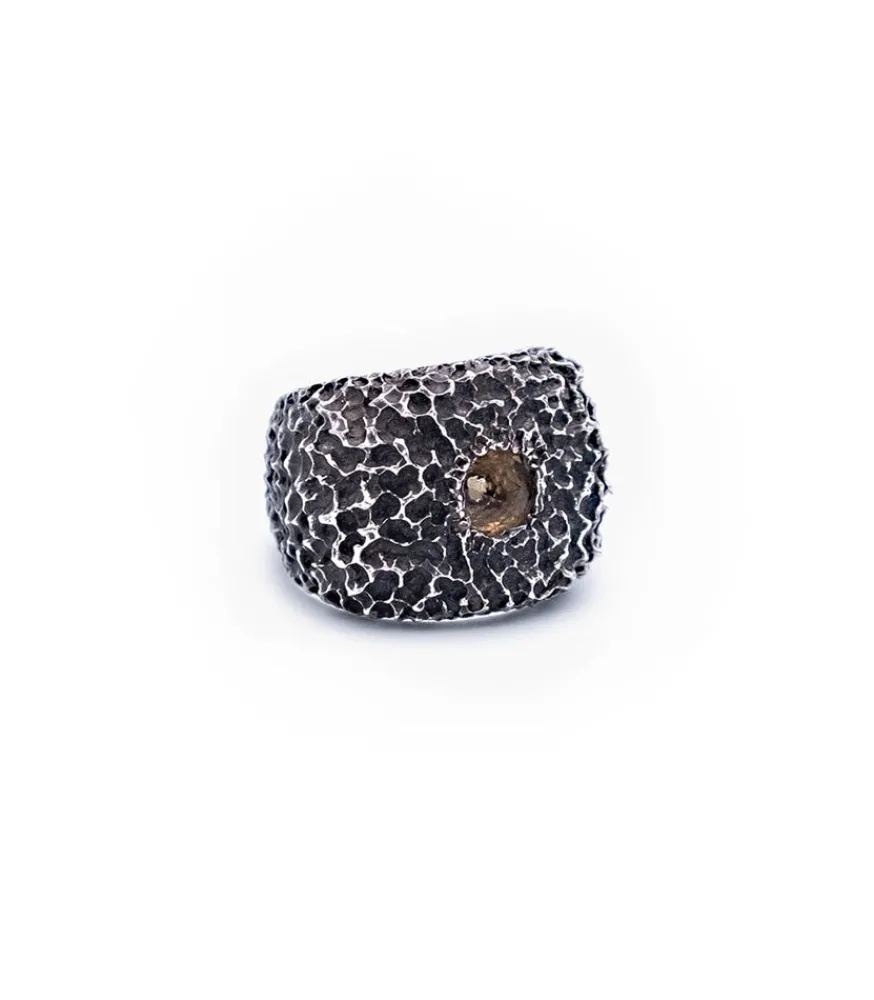 Bague 6X6 Imaginée Par Le Joaillier Ylang Ravel Pour Sa Maison Éponyme. Une Chevalière Unisexe Au Design Rond Qui Dévoile En Son Centre Un Quartz Fumé Serti, Mêlant La Brutalité De La Matière À La Délicatesse De La Pierre Précieuse.